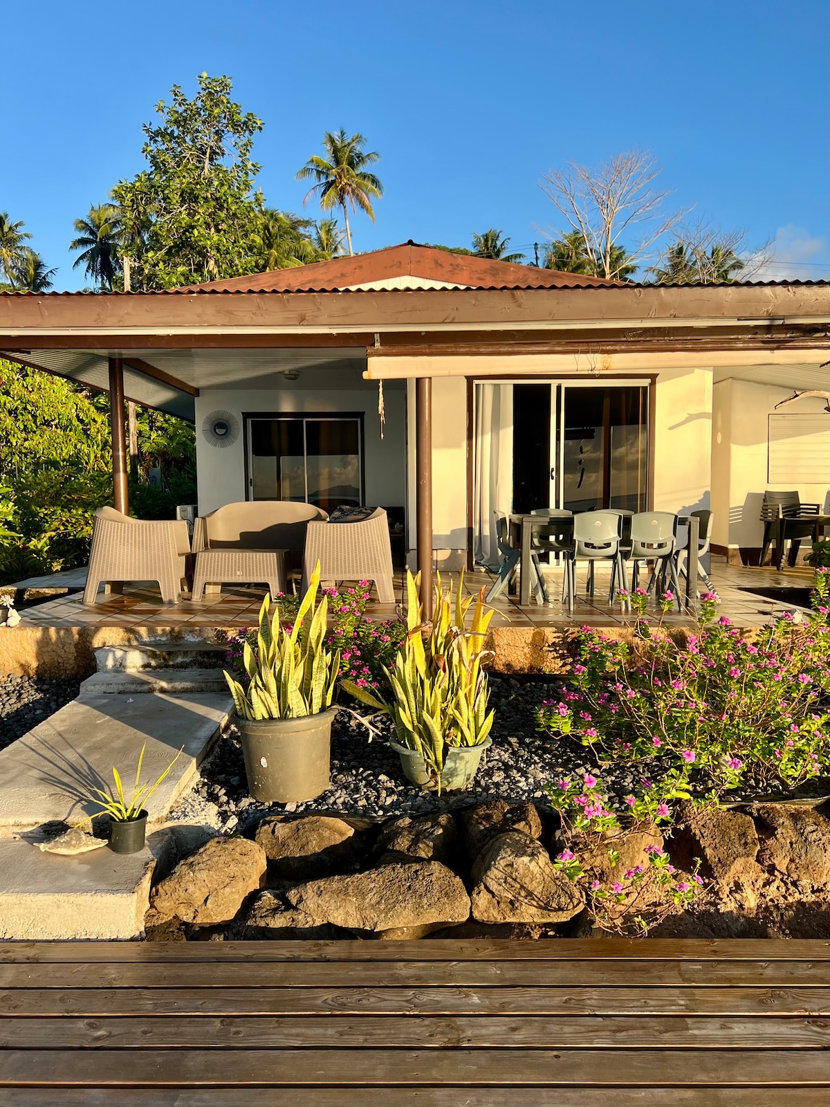 Homestay, bíodh fanacht uathúil os comhair na farraige agat, le radharc iontach ar Bora Bora agus sunsets iontacha. Bain sult as imeall na farraige le Cadhc atá ar fáil i dtimpeallacht chiúin, laistigh de réadmhaoin atá fálaithe go hiomlán chun do shuaimhneas a chinntiú. Bungaló fairsing lena n - áirítear: • 1 seomra leapa/seomra suí mór ina bhfuil seomra folctha príobháideach. • 1 lochtán príobháideach