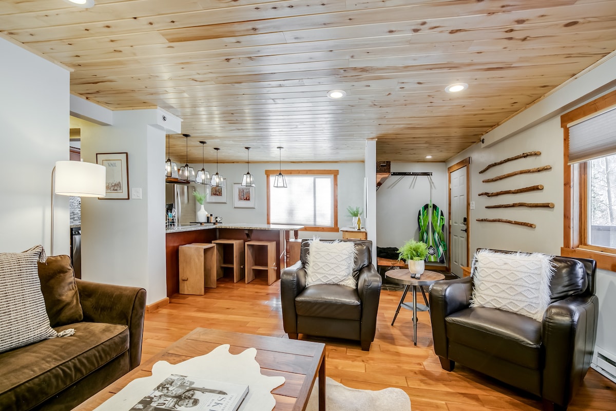 Nua - Aimseartha Vail Retreat | Radhairc Néalacha & Fíon SAOR IN AISCE! 🍷 Tá do shaoire ghearr shléibhe fhoirfe ag fanacht leat! Neadaithe in Pitkin Creek, East Vail, cuireann an árasán nua - athchóirithe seo radhairc iontacha sléibhe agus bailchríocha nua - aimseartha ar fáil. Teolaí ag an teallach dóite adhmaid le buidéal fíona dea - mhéine. Níl ach nóiméad ó sciáil, bia agus eachtraí lasmuigh den scoth. Cuir in áirithe anois é chun an saoire is fearr riamh a chaitheamh in Vail! ⛷️