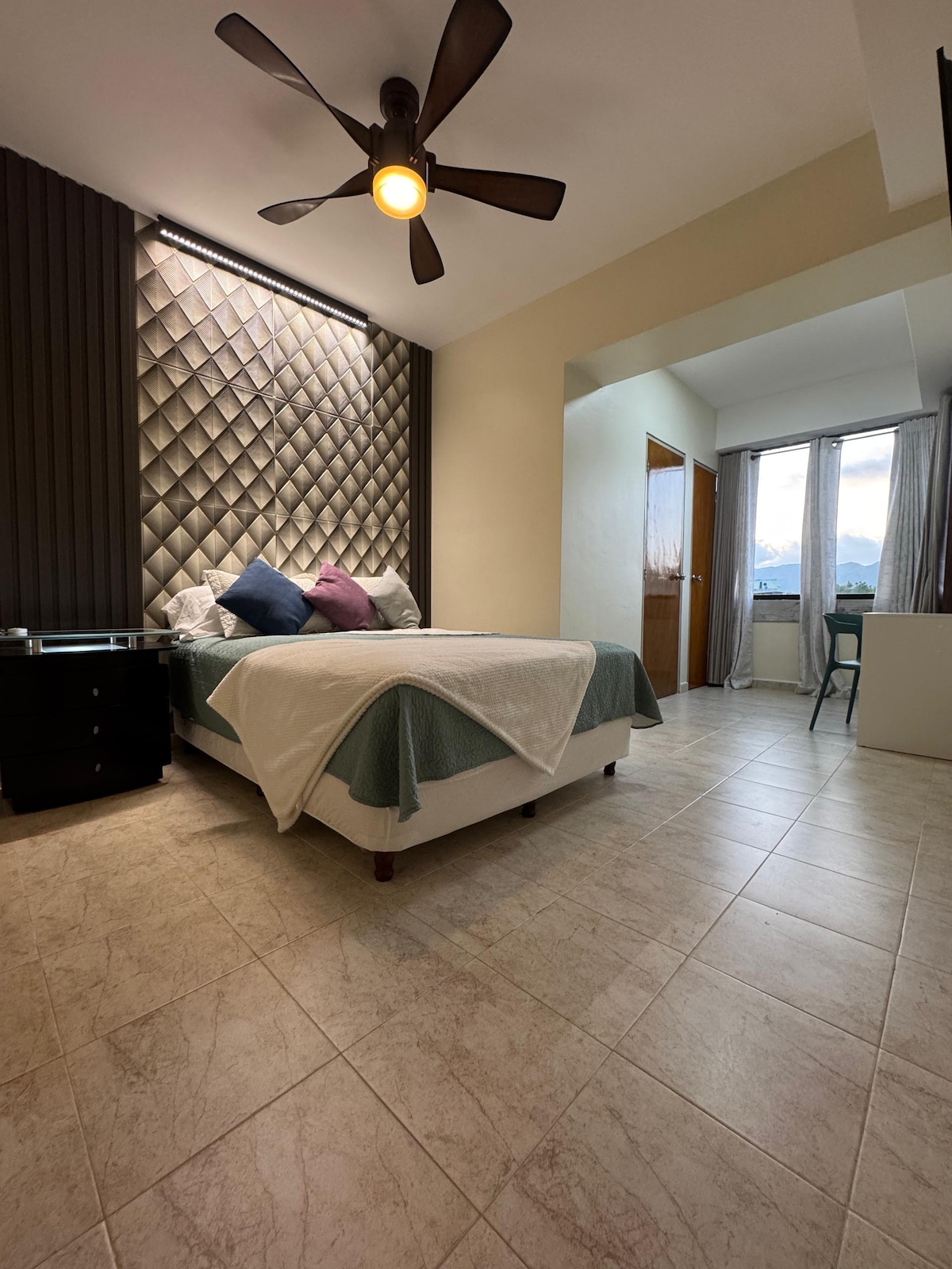 Cuenta con una vista hermosa a la montaña en una urb privilegiada. Habitación con cama queen, área de trabajo y baño privado. En la sala cuenta con un sofá cama. A/A, Wifi, TV con Netflix, Lav/secadora, Cocina equipada, toallas y productos de aseo personal, plancha para ropa, secador de cabello. Planta 100%, agua 24/7, un puesto techado. A una cuadra se encuentran 2 centros comerciales con supermercados, feria de comida, Farmatodo. Fácil acceso a distintas zonas de la ciudad y a la autopista.