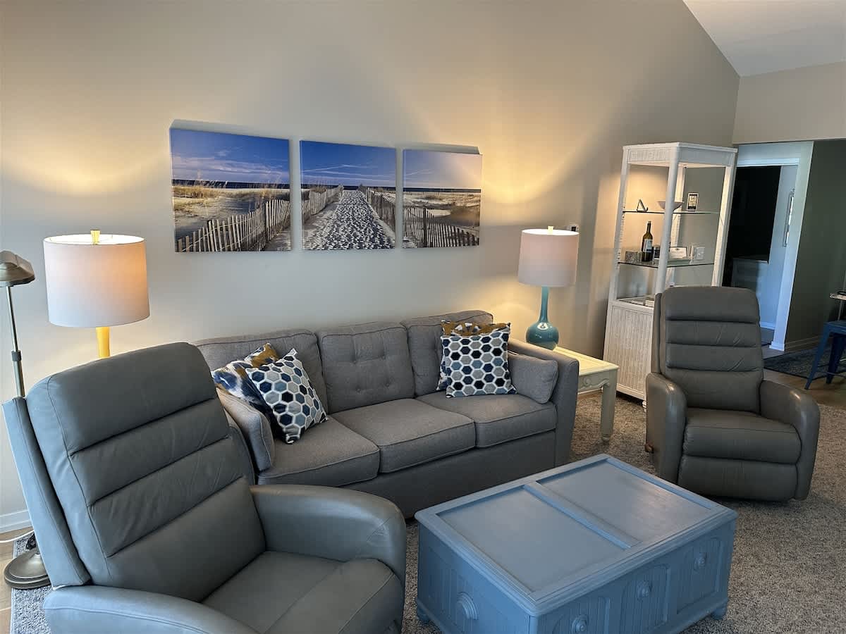 DÁTAÍ SAMHRAIDH OSCAILTE... Is éard atá sa Beach House ná árasán gan chéimeanna ar an gcéad urlár, 7 dteach ó Newcome Beach; dhá bhloc ar shiúl ó thránna gainimh agus ó luí gréine áille! Máistirsheomra leapa w/leaba nua ar mhéid Rí, cairpéad nua, vardrús siúil isteach, agus folcadán príobháideach le cithfholcadán nua faoi bhacainn íseal ADA. Brú uisce iontach! Tá leaba dhá leaba XL sa 2ú seomra leapa, (tochtanna nua) agus seomra folctha le cithfholcadán taobh amuigh den halla. Leaba thoilg nua in LR. Paitió príobháideach le gríoscán nua 6 dhóire. Táimid ar "thaobh na trá" den bhaile.