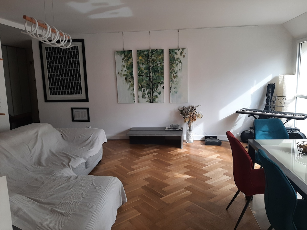 43 m2, athchóirithe i mí an Mheithimh 2021, geal, ina bhfuil 4 dhuine. Tugaim tús áite do ghlaineacht an áitribh. Seomra suí mór le leaba thoilg, cistin atá feistithe go feidhmiúil (oigheann, pláta, micreathonnán, cuisneoir), seomra leapa amháin le leaba dhúbailte, seomra folctha le leithreas, Wi - Fi. Línéadach tí curtha ar fáil. Freastalaíonn iompar poiblí go han - mhaith (bus 58 agus 59, líne fhobhealaigh 13, traein, tram) chun cuairt a thabhairt ar Pháras nó dul chuig Parc des Expos (de shiúl na gcos!). Ideal do taispeántóirí Salon Porte de Versailles.