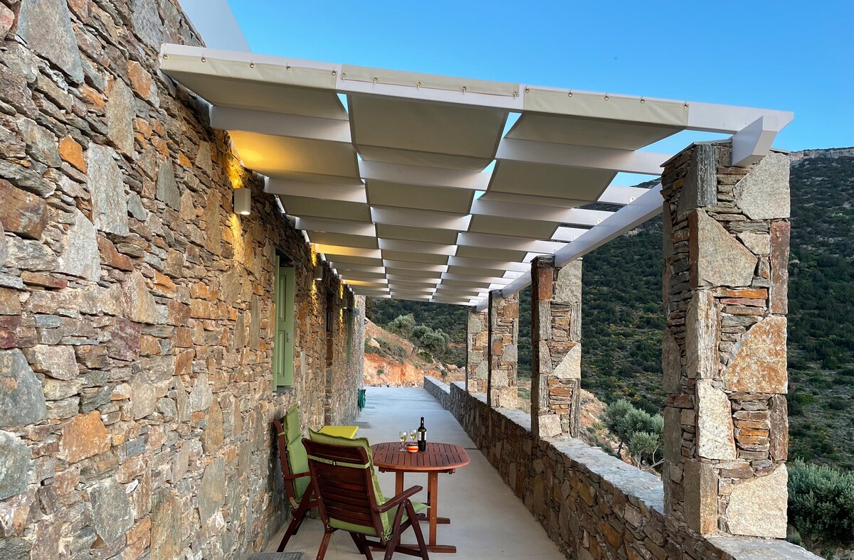 Teach i sráidbhaile ciúin iascaireachta Faros, thar thrá Glyfo. Tá seomra leapa amháin sa teach ina bhfuil leaba dhúbailte agus leaba shingil, agus is féidir leaba shingil fillte a chur leis. Sa seomra suí, tá cistin lánfheistithe agus dhá leaba thoilg ionsuite amháin, agus is féidir leaba shingil bhreise a fhilleadh. Sa seomra folctha, tá meaisín níocháin ann. Seachas an t - ardán fairsing, tá radharc iontach ar an trá le fáil i ngach seomra.