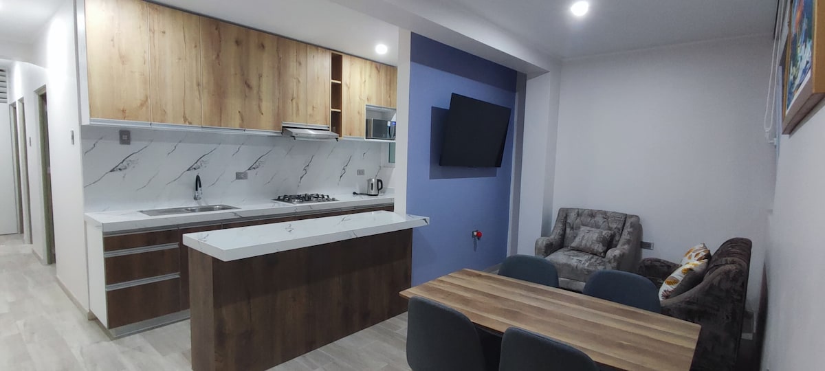 Árasán 🌺álainn🍃🌺 atá deartha chun fanacht deas a roinnt (do lánúin, do dhuine singil nó do 3 chara) atá suite ar an tríú hurlár de theach. Tá seomra suí mór ann, atá feistithe ionas gur féidir leat do mhiasa is fearr a ullmhú🍝🍹🥂, balcóin chun luí gréine álainn a shamhlú agus tú ag rocáil ar chathaoir chrochta the, a chuimhníonn ar do leanbh@ taobh istigh🍃, spás oifige baile, seomra leapa agus leaba thoilg 💖 Táimid 5 nóiméad ar shiúl ó Downtown Huacho agus Centro Comercial Plaza del Sol.