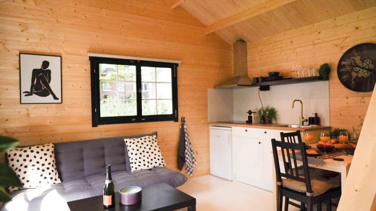 Idyllic garden house located in large backyard. Backyard is shared with the residents of the house. Garden house is fully insulated, equipped with private bathroom with shower & toilet. Garden house (approximately 26m2) is fully furnished with a romantic double bed (160x200), dining table, television, kitchen unit (no cooking facilities) but a fridge and coffee / tea facility. Wifi. Enjoy your breakfast which you can prepare yourself at a time in the garden house.