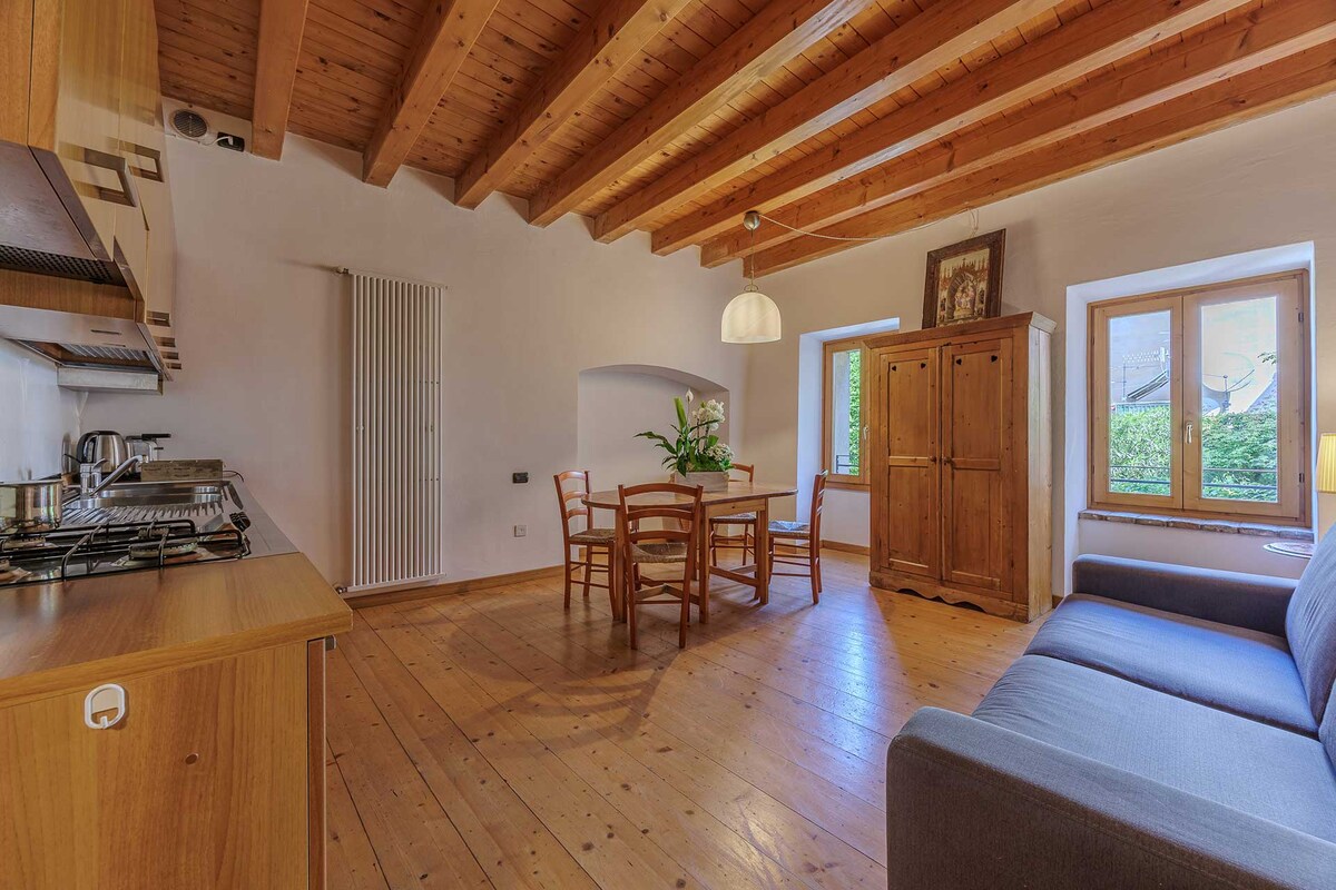 Árasán eisiach ar an mbunurlár /ar an taobh ó dheas de Chaisleán Planta, le húsáid gairdín, méid 85m2, oiriúnach le haghaidh fánaíochta, sciála nó scíth a ligean: ar imeall an Choirnéil Uachtarach i bhfad ó Merano atá leabaithe i gcrainn úll agus hiodrangeas go díreach ar an Maiser Waal, tá an caisleán Planta a tógadh sa 12ú haois.
