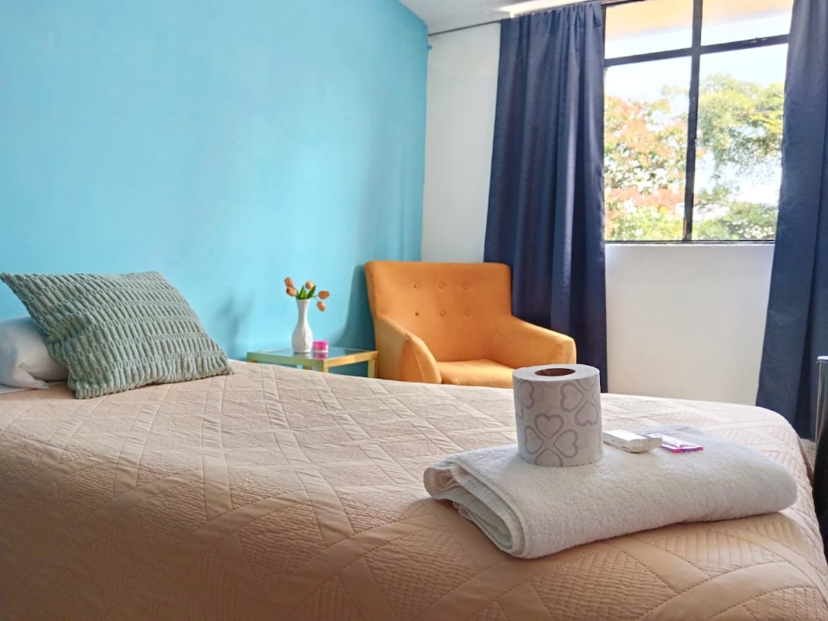 Habitación doble independiente de casa con vista a la naturaleza que te hace sentir como en la jungla pero a la vez con la acogedora privacidad, para trabajar y descansar. La habitación principal es de aproximadamente 3x4 metros con cama matrimonial y la otra habitación con cama individual mide aproximadamente 2.5 m x 3m donde también esta un baño completo para uso personal.