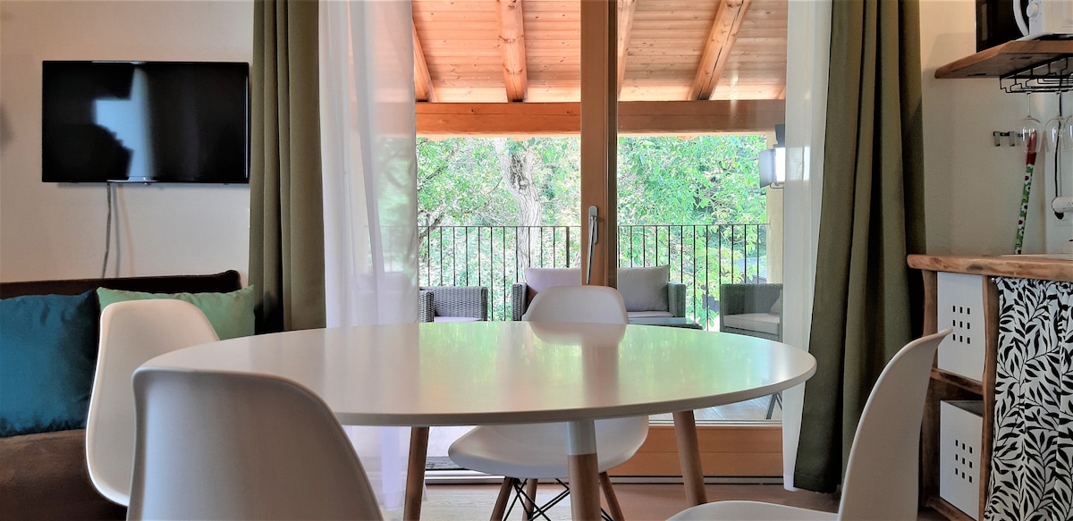 Árasán iomlán feistithe, dhá sheomra leapa, seomra folctha le tobán folctha agus cithfholcadán, cistin fheistithe, lochtán mór ar féidir leat dinnéar a fháil air nó lón a bheith agat agus tú ag baint taitnimh as radharc iontach. Tá an teach tumtha i gcrann glas olóige, gairdín mór, páirceáil phríobháideach, saor in aisce agus clúdaithe. Ag siúl síos 300 méadar, thar an seanbhaile, téann tú díreach isteach sa sráidbhaile, ar an loch, áit a bhfuil beáir, pizzerias, bialanna agus minimarket. id. cód: M0230140214