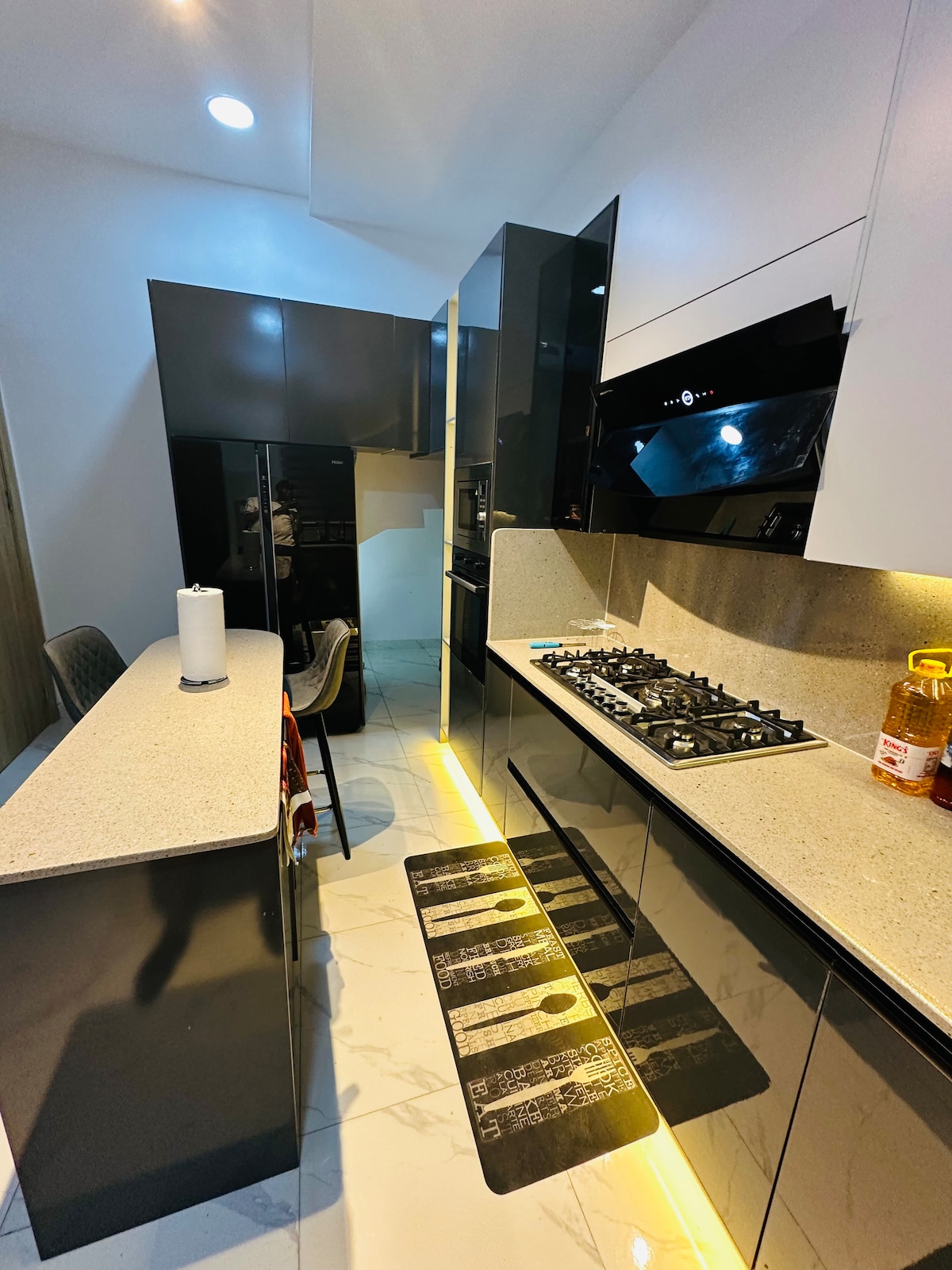 Teach comhaimseartha fairsing 4 sheomra leapa atá oiriúnach do theaghlaigh agus a bhfuil atmaisféar álainn ann in eastát seirbhísithe agus daingnithe ina bhfuil nithe is díol spéise in aice láimhe amhail ollmhargaí, beáir, bialanna agus pictiúrlann. Tá an teach lán troscáin agus feistithe chun freastal ar do riachtanas le; ** Cumhacht 24 uair an chloig (le inbhéartóir 10kva mar chúltaca) ** Slándáil 24/7 ** Seomra suí agus seomra bia álainn compordach. **2 Bhalcóin ar 2 urlár **Cistin fheistithe **Netflix agus DSTV (Cable TV) ** Glanadh tí ** Idirlíon Tapa (Idirlíon snáthoptaice)