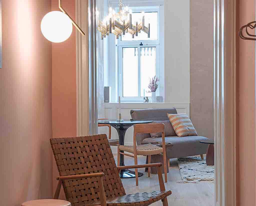 Árasán ar bharr an dín chluthar, athdheartha ag breathnú amach ar chlós glas i Vín Gründerzeithaus stairiúil. Rinneadh brící agus gnéithe adhmaid atá ann cheana féin a athchóiriú go cúramach, a nochtadh agus a chomhlánú le fuinneog mhór lánléargais tosaigh agus ardán lasmuigh.