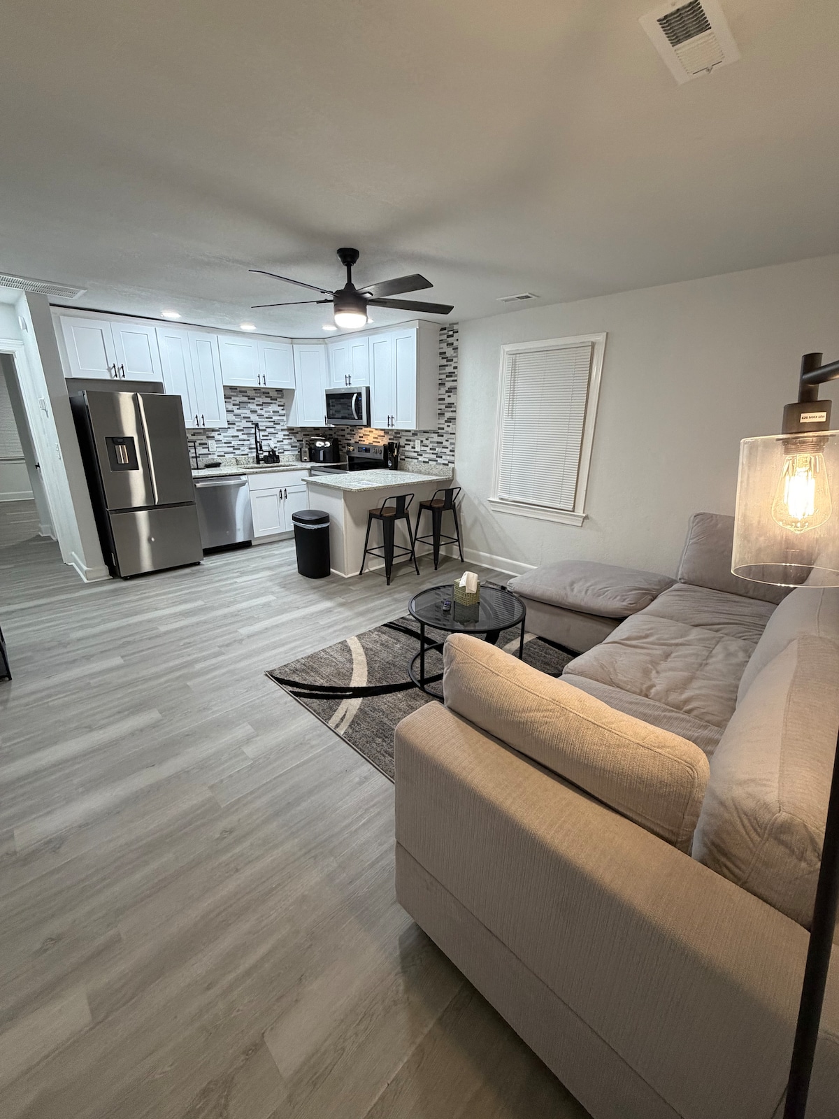 Codlaíonn Árasán Éifeachtúlachta 1bd/1ba úrnua 2 go compordach. Bealach isteach príobháideach, seomra folctha, cistinéad agus spás maireachtála nach bhfuil comhroinnte ar leithligh go hiomlán. Suíomh den scoth. Siúl/Rothar chuig gach rud i 5 nóiméad lena n - áirítear an trá, clárchosán, cosán rothar agus siúlóide, bialanna cois uisce, tithe tábhairne & beáir. 0.6 míle go dtí imeall na farraige 0.8 míle chuig an Ionad Comhdhála VB & Plex Spóirt Chuir LÍNÉADACH TÍ & TUÁILLÍ 65"Flatscreen TV ar FÁIL! Leaba Pillow - Top King Sized Cuisneoir Caife Micreathonnán Eochaircheap Bealach Isteach