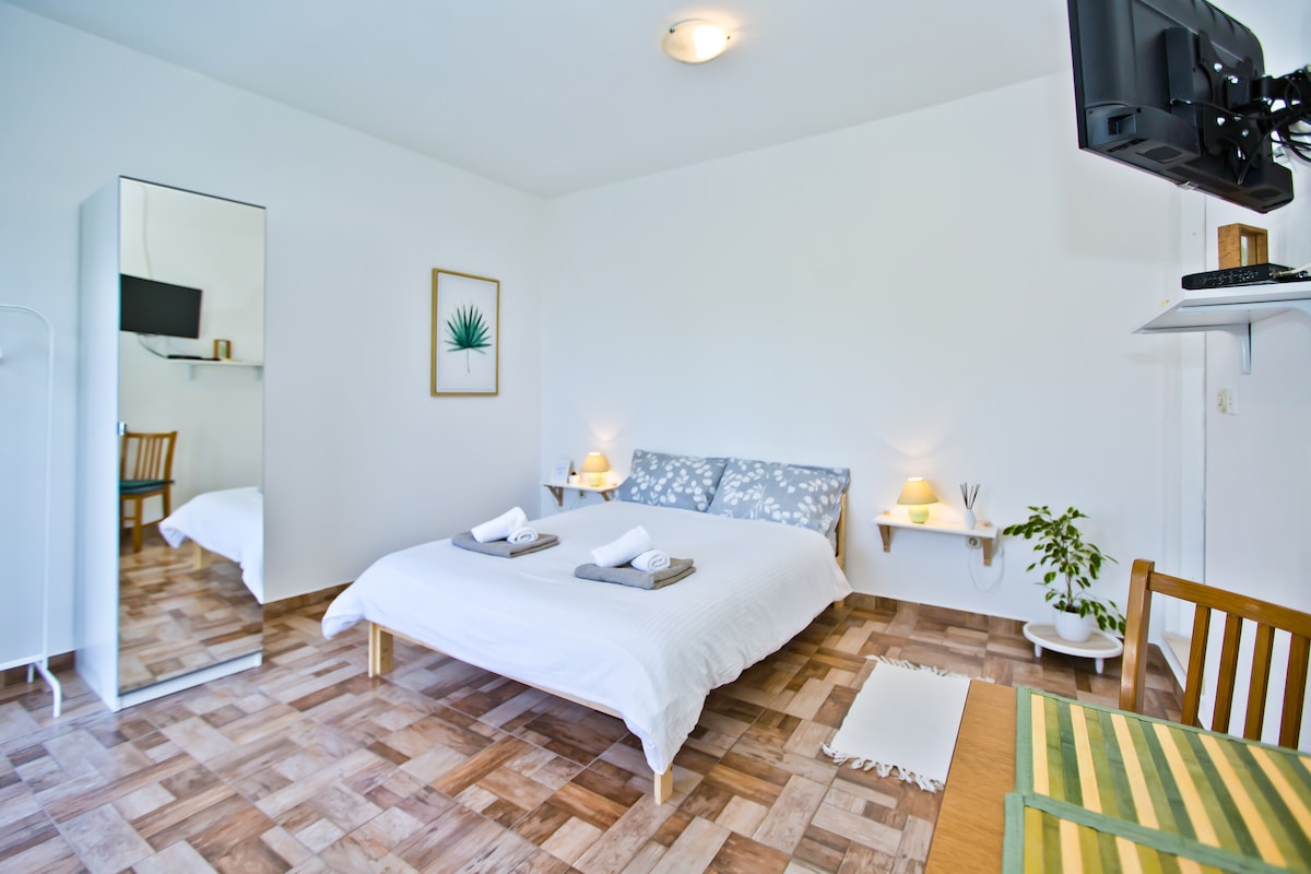Seomra príobháideach teolaí ina bhfuil cistin bheag ach dea - fheistithe chun béilí, seomra folctha príobháideach, agus balcóin mhór a dhéanamh ag breathnú amach ar an bhfarraige, Oileáin Pakleni, agus oileáin Vis agus Korčula. Mar gheall ar luí na gréine álainn rómánsúil is é seo an áit fhoirfe chun deireadh a chur leis an lá. Wi - Fi saor in aisce, níochán, spás páirceála, tuáillí trá más gá, AC, agus leideanna iontacha Hvar ó d'óstach (duine áitiúil) agus go leor eile :) Tar chun do scíth a ligean agus taitneamh a bhaint as baile Hvar!