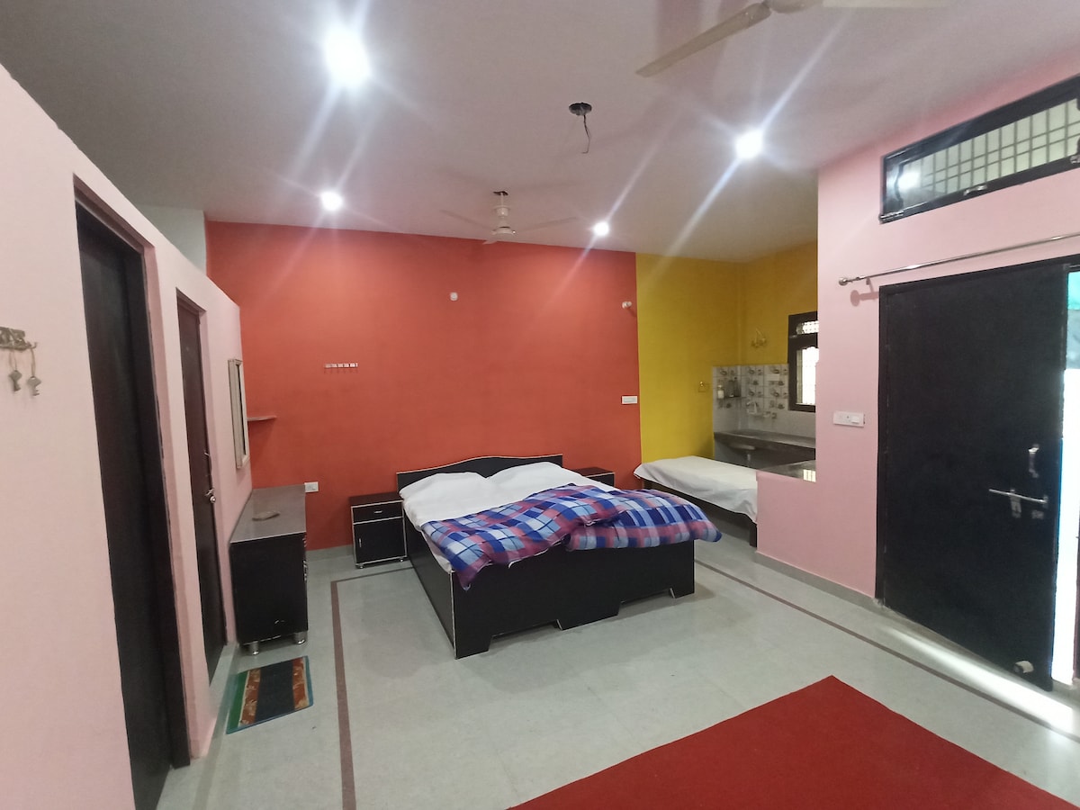 Stay at Bhakti Vanam, just 1.5 kms from the sacred Prem Mandir in Vrindavan. Enjoy a spacious studio with air conditioning, high-speed Wi-Fi, a private entrance, and a cozy balcony. Perfect for two guests, with an extra bed available if needed. Convenient to temples and public transport, and scooty rentals can be arranged. Full access to a well-equipped kitchen and clean washroom. Ideal for families or solo travelers seeking comfort and peace in a spiritual place.