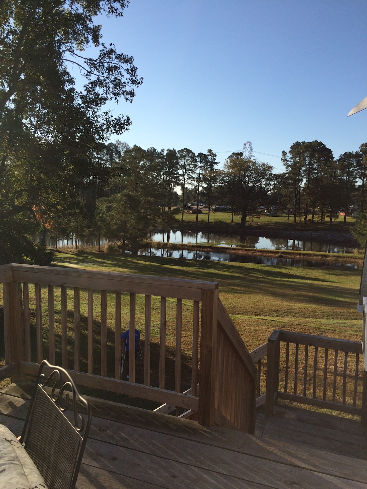 Suíomh álainn ar 8 n - acra in aice le Jordan Lake agus Conair Tobac Mheiriceá - 30 nóiméad nó níos lú chuig RDU, RTP, Raleigh, Durham agus Chapel Hill. Lánúsáid as teach aíochta príobháideach 2 sheomra leapa ina bhfuil staighre bíseach a théann suas go seomra leapa lochta. Thíos staighre, tá síleálacha 20 troigh agus fuinneoga ollmhóra ag breathnú amach ar ár bhféarach capall. Foirfe do thréimhsí fanachta iascaireachta - níos lú ná 10 nóiméad ó Jordan Lake, agus neart spáis páirceála. Tá luchtú feithiclí leictreacha Leibhéal 2 ar fáil.