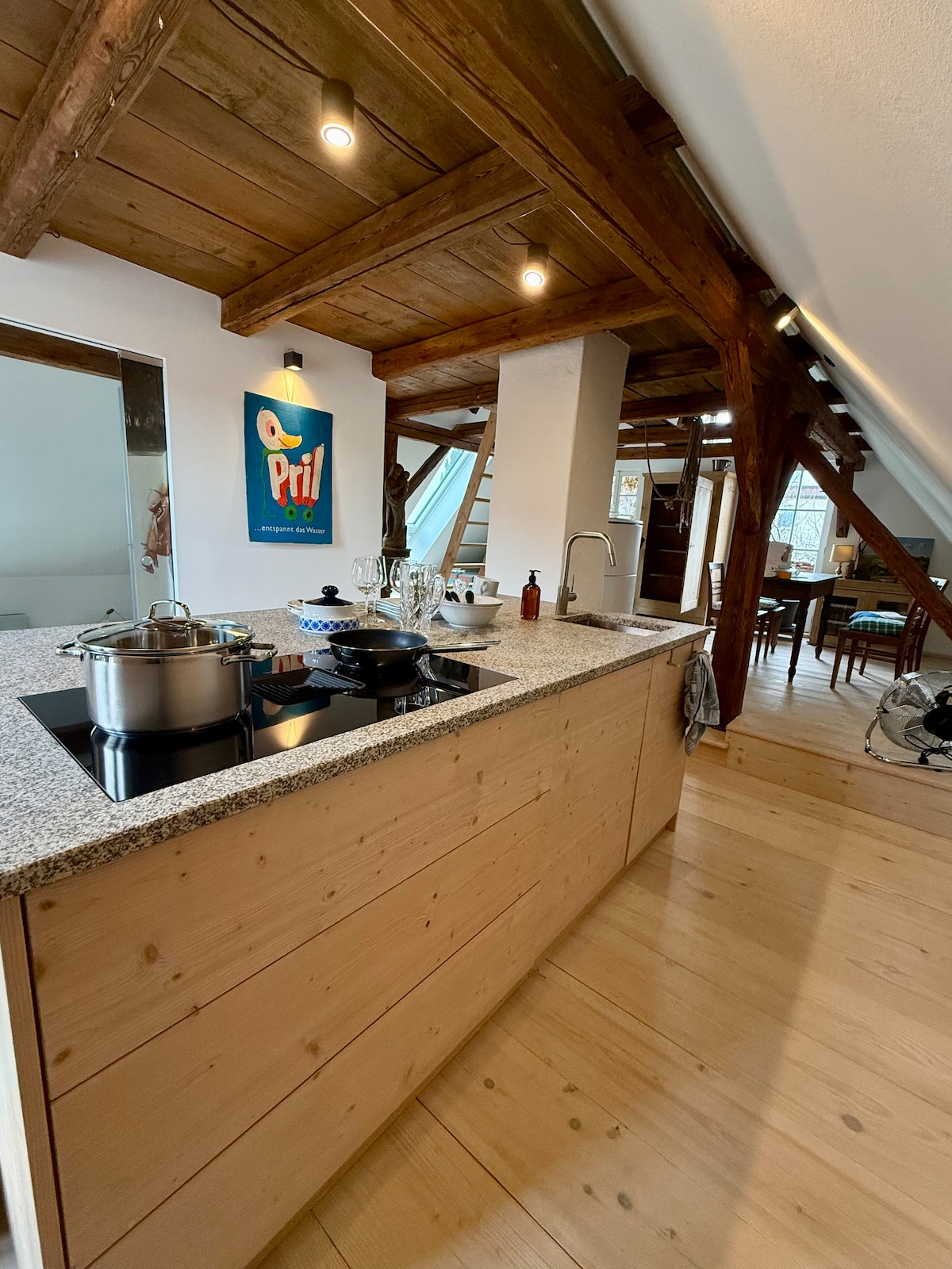 Fáilte chuig an 'Atico' teolaí agus nua - aimseartha ag an am céanna thar dhíonta an tseanbhaile i lár chrios coisithe Weidener. Cuireann an t - árasán 100m2 seomra mór maireachtála agus bia, dhá sheomra leapa, cistin lánfheistithe, seomra folctha ina bhfuil tobán, cithfholcadán, meaisín níocháin agus triomadóir, leithreas ar leith agus spás oibre príobháideach ar fáil duit. Tá sé oiriúnach freisin le haghaidh tréimhsí fanachta níos faide. Ceadaítear peataí. Tá spás páirceála ar fáil más mian leat. Tá dhá árasán eile sa teach céanna.