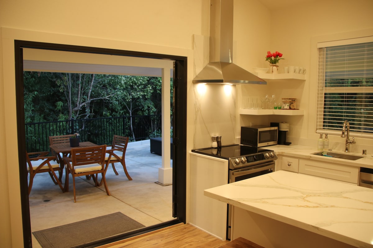 Rinneadh athchóiriú gairmiúil ar an teach cosúil le hóstáin seo chun compord, áisiúlacht agus taitneamh d'fhanachta a uasmhéadú. Tá WOW factor ollmhór sa chistin le fearais ard - deireadh cruach dhosmálta, stocáilte go hiomlán, oiriúnach le haghaidh cócaireachta, siamsaíochta nó bácála. Doirse maireachtála dúbailte laistigh/lasmuigh a osclaíonn suas go dtí an spás álainn cúlchlós atá lán le troscán paitió, beárbaiciú agus trealamh dóiteáin, oiriúnach chun taitneamh a bhaint as ár n - aimsir iontach CA. Teilifís Chliste i ngach seomra do na hoícheanta Netflix sin!