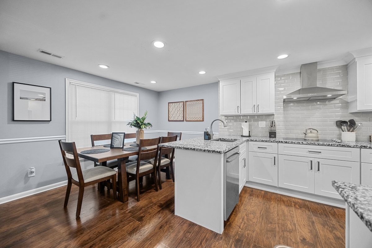 Tearmann íoslaigh galánta teolaí ar fad (duitse amháin) ina bhfuil bealach isteach príobháideach féin agus páirceáil shannta. Siúil go dtí Crown Downtown/ RIO - Rochtain ar 40+ bialann, Amharclann AMC, Dave & Buster's, Target, Starbucks agus go leor eile Déan iniúchadh ar DC, Virginia & Baltimore - Tá Metro 3 mhíle ar shiúl. Tá stad an bhus díreach chun tosaigh. Bailchríocha ar scála aníos -2 sheomra leapa, 2 leaba bhanríona & tolg Gairdín cúil/ Paitió fálaithe - Mini - Kitchen, Beár Teilifís chliste scáileán 80 orlach - Deasc spás oibre, monatóir Seomra folctha príobháideach cic WI - FI TAPA