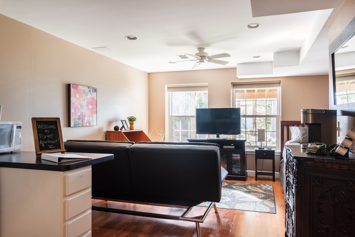 Árasán teolaí díreach 8 nóiméad sa charr ó lár Ann Arbor agus 10 nóiméad sa charr ón Staidiam. Cistin iomlán, leaba chompordach, cúinne léitheoireachta milis, agus neart saoráidí. Suíomh áisiúil in aice le Weber's Inn. Siúlóid dhá nóiméad chuig dhá bhealach bus, chomh maith le rochtain éasca ar shiopaí grósaera agus ar shiopaí caife. Achar siúil chuig cosáin fánaíochta a théann trí choillte síochánta, le radharcanna amach ó dhá loch intíre. Tá an t - árasán ceangailte leis an bpríomhtheach (nach bhfuil san áireamh), agus tá bealach isteach slán ar leith ann.
