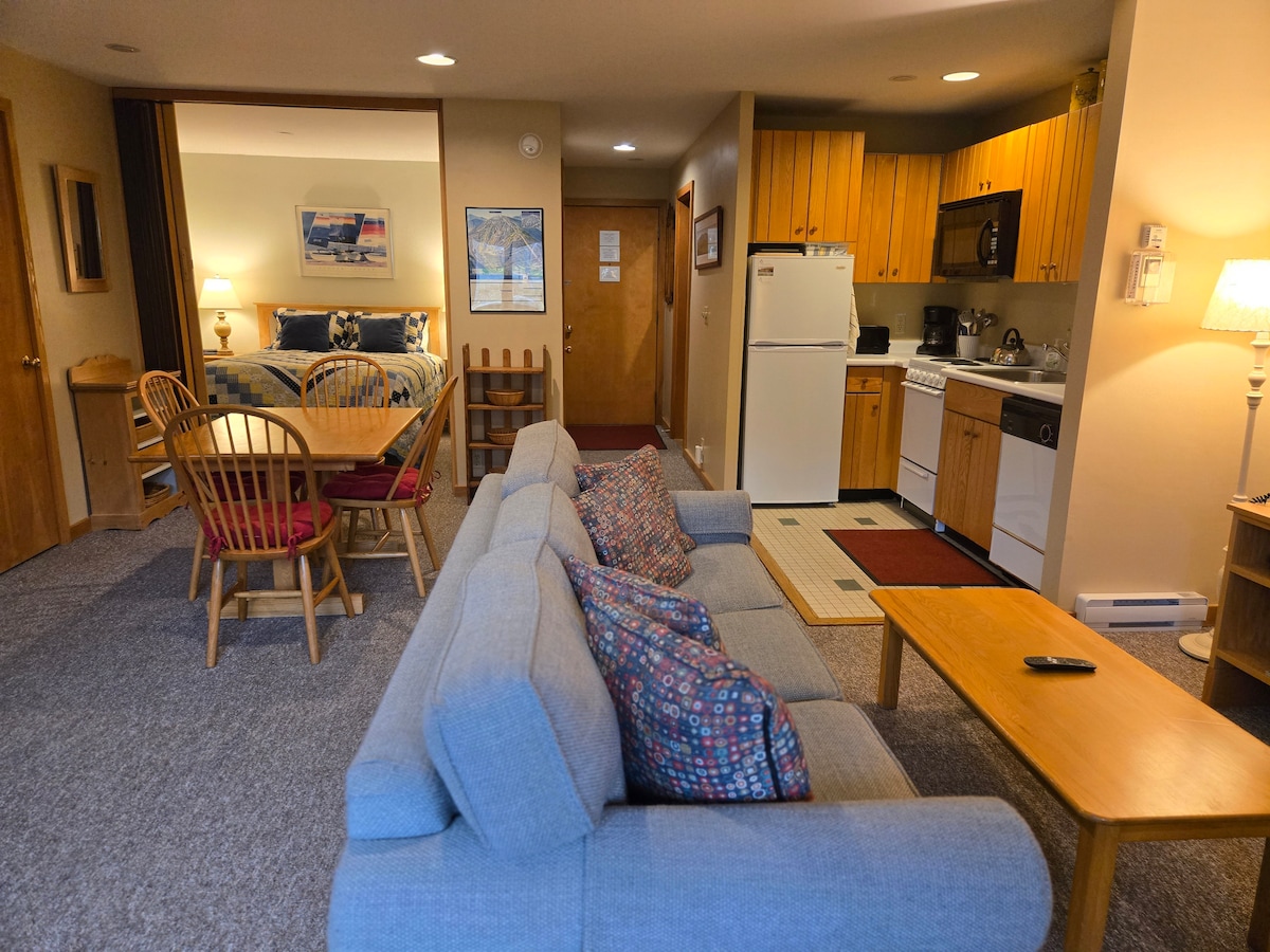 Tá an árasán cluthar compordach sciála isteach/sciáil amach seo in áit inmhianaithe agus níl ann ach turas gearr cathaoireach go bun Shliabh Sugarloaf. Sciáil nó rothar sléibhe go díreach ón árasán! Oiriúnach do theaghlaigh. Tá leaba bhanríona socraithe in alcove, leaba murphy banríona agus tarraing amach leaba thoilg lánmhéide agus tá go leor spáis codlata ar fáil. Rochtain áisiúil laistigh ar an linn snámha, ar na tobáin the agus ar an sabhna ag an Sugarloaf Sports and Fitness Center (tá táillí breise i bhfeidhm). Cistin iomlán, agus ceann den bheagán le AC don samhradh!