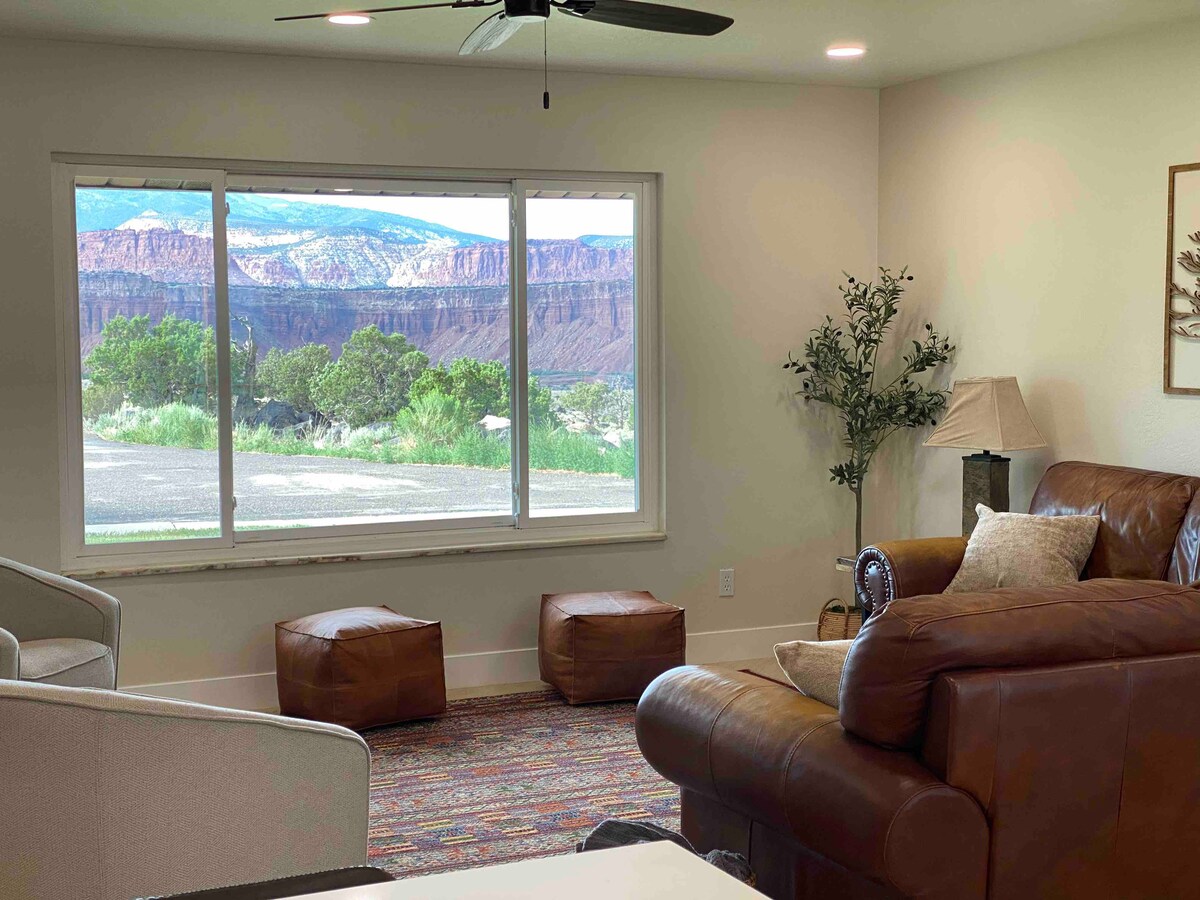Fáilte go Sléibhte Aislinge Utah! Féach ar d'ábhair imní ag leá sa Teach Galánta seo, atá saincheaptha d'eispéireas Capitol Reef! Tá na bunriachtanais go léir le haghaidh tearmann suaimhneach le feiceáil sa lóistín saoire 2Bed/2BATH seo! Bí sáite sa dúlra ag bun do shliabh príobháideach gaineamhchloiche féin agus radhairc iontacha agat! Bain sult as cupán caife ar an deic agus tine te ann agus tú ag breathnú ar éirí na gréine! Caith an lá ag fánaíocht agus ag féachadh ar radhairc agus an oíche ag ligean do scíth sa sabhna agus ag faire ar na réaltaí cois na tine!