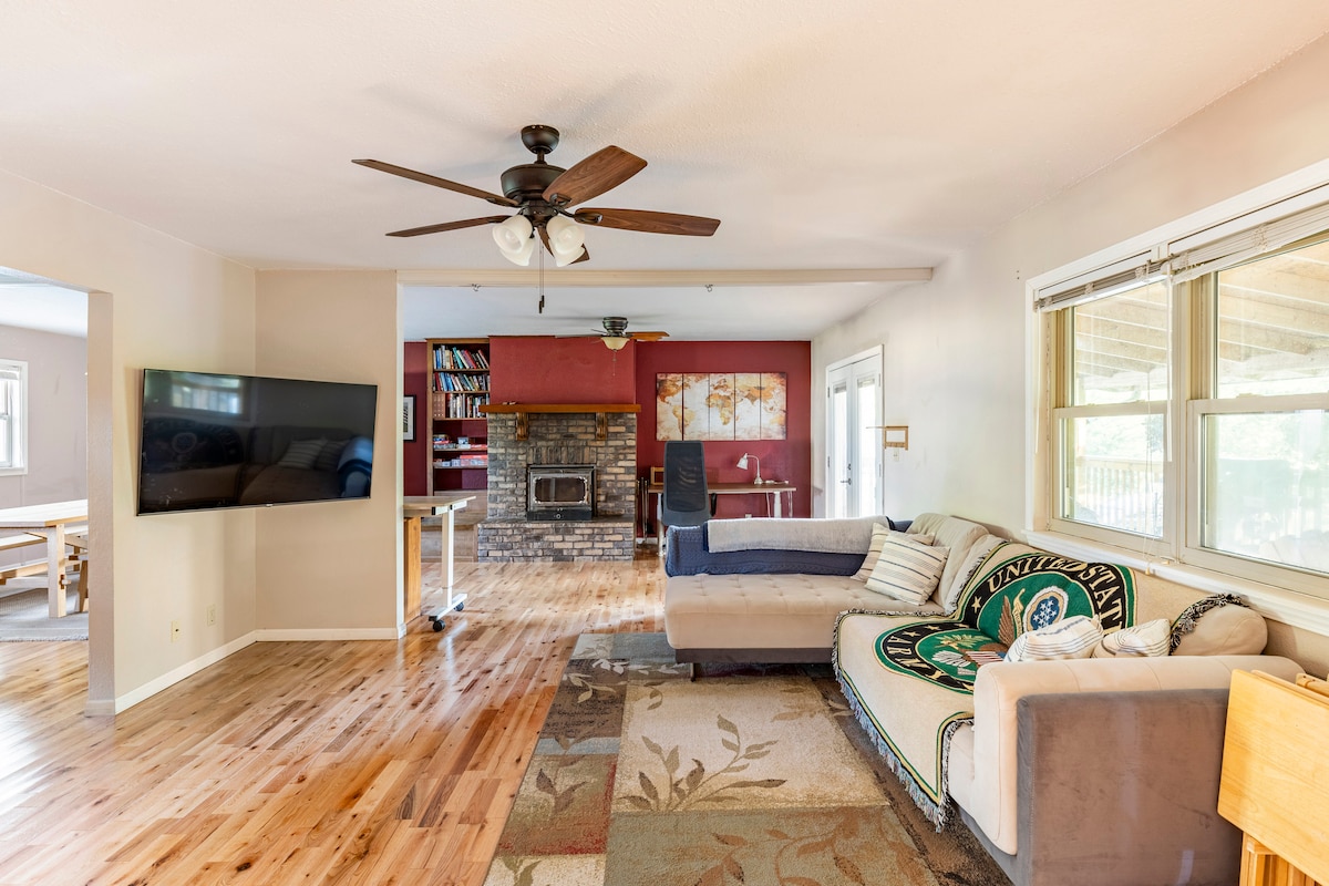 Déan dearmad ar do bhuairt sa spás fairsing suaimhneach seo. Tá Cábán Eachtraíochta amuigh faoin tír, ach fós gar do Fort Leonard Wood agus do shaoráidí áitiúla! Áit iontach le haghaidh bunchéimeanna oiliúna nó teacht le chéile teaghlaigh. Bain sult as na radhairc iontacha amach ón deic chúil nó caith an tráthnóna ag déanamh cuimhní cinn agus tú ag imirt cluichí sa seomra cluiche ollmhór! Leis na mílte acra den Fhoraois Náisiúnta agus rochtain phoiblí ar abhainn díreach síos an bóthar, tá go leor roghanna ag an gcábán seo maidir le gníomhaíochtaí lasmuigh.