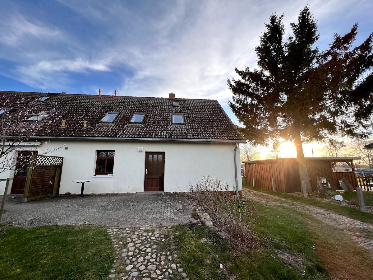Tá an teach ar imeall an tsráidbhaile iontach ciúin ar imeall cheantar Diedrichshagen, timpeallaithe ag páirceanna leathana, foraois agus an dúlra. Is furasta teacht ar thránna Usedom, Lubmin agus Rügen sa charr. Bain sult as fairsinge an dúlra, sóisialú sa teach fairsing agus ar an réadmhaoin nó tairiscintí cultúrtha bhaile Greifswald in aice láimhe. Cuireann leath an tí 120 méadar cearnach de spás maireachtála ar fáil ar dhá urlár iomlána.