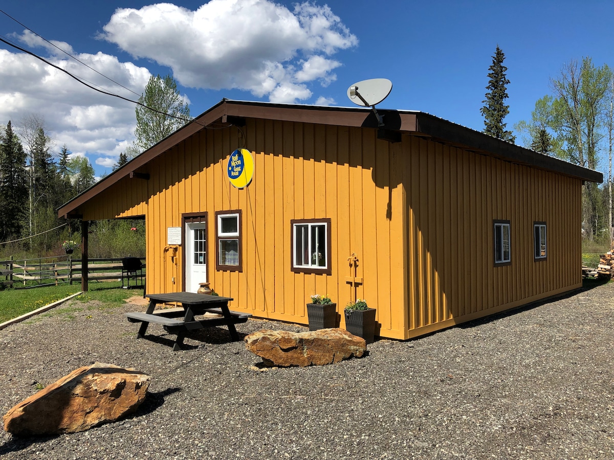 Tá an Half Moon Guest House ciúin agus síochánta, uathúil, atmaisféar compordach agus fáilteachas cairdiúil. Níl sé ach cúpla nóiméad go Wells Gray Park agus 4 km ón mbaile. Tá an teach aíochta ar an réadmhaoin chéanna le teach an úinéara. Ar ár mion - rainse beag tá 5 chapall, 2 PUP cairdiúil agus piscín beag gleoite amháin againn. Tá an chistin feistithe go hiomlán le miasa, potaí, pannaí, srl. Cuirimid caife/tae ar fáil freisin. Is féidir lenár nAíonna an poll dóiteáin agus an beárbaiciú a úsáid agus a scíth a ligean ar an bpaitió.