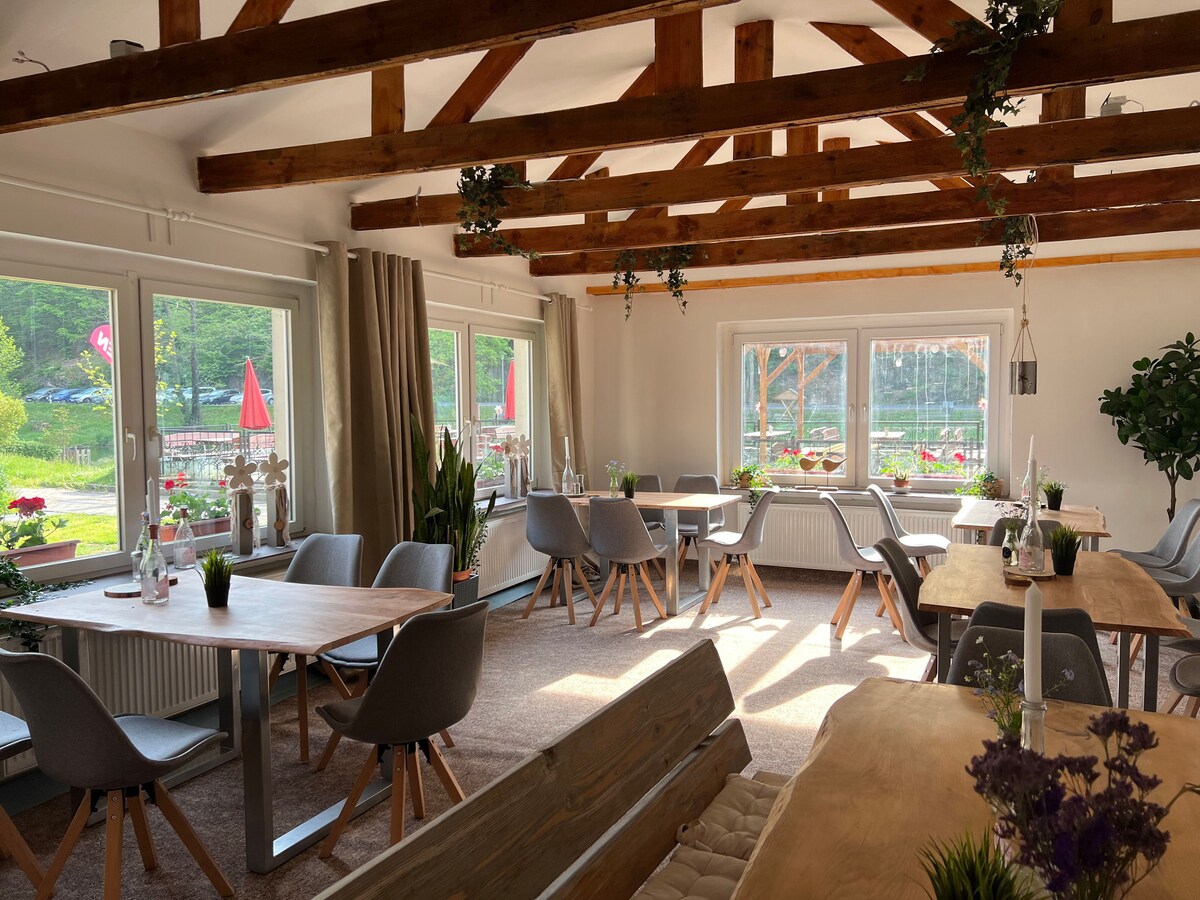 Faigh blaiseadh den Harz inár seomra dúbailte compordach, díreach ag tús an ardaithe Brocken! Tá leaba dhúbailte chompordach, áit suí ina bhfuil teilifíseán, rogha tae, citeal, deasc agus seomra folctha príobháideach ina bhfuil triomadóir gruaige agus cithfholcadán feistithe inár seomraí. Bain sult as do scíth íon inár gceantar folláine le sabhna agus seomra scíthe, agus bí ar ár mbuifé bricfeasta saibhir ar maidin. Tá gach seomra óstáin neamh - thobac. Ní cheadaítear peataí.
