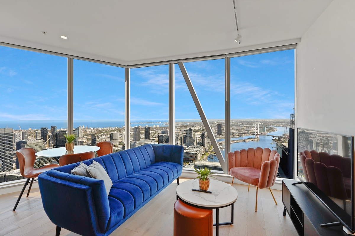 Suite ar an urlár uachtair de choimpléasc árasán is fearr in Melbourne, tá radhairc lánléargais gan bhriseadh ag an árasán dea - dheartha seo a chuimsíonn ón aigéan go dtí na Dugthailte áille. Le fuinneoga ón urlár go dtí an tsíleáil sa seomra leapa, beidh tú ag dúiseacht ar cheann de na radhairc is fearr in Melbourne. Suite in áit áisiúil, tá an t - árasán seo achar siúlóide 3 nóiméad chuig príomhstáisiún traenach Melbourne, Stáisiún Croise an Deiscirt, mar aon le seirbhísí miondíola agus riachtanais siopadóireachta grósaera.