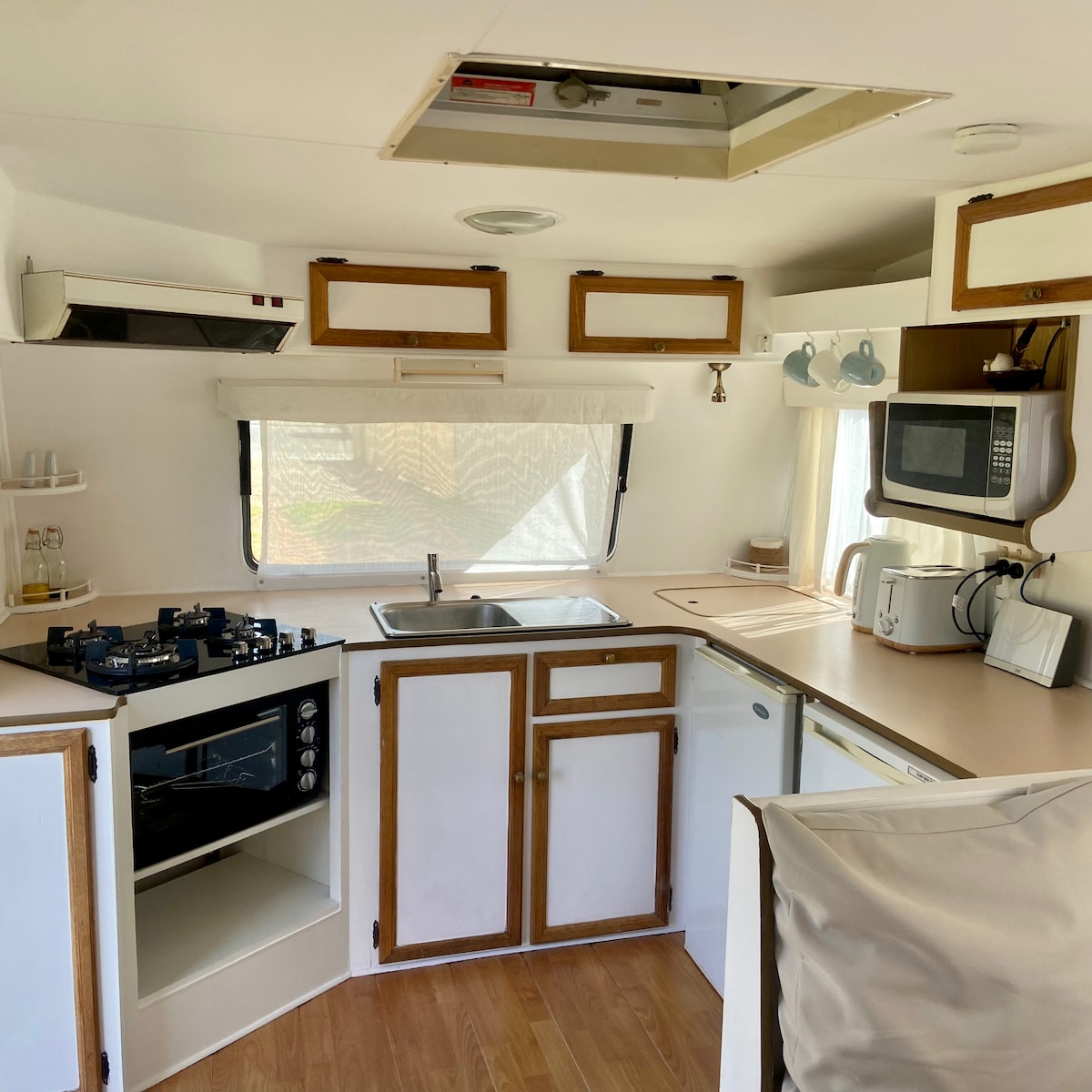 Athchóiriú uathúil, carbhán féinchuimsitheach ina bhfuil cistin, tolglann, Wi - Fi, leaba dhúbailte (móide tolg) agus seomra folctha, le cumhacht, aonad aerchóiriúcháin / téimh. Iompar poiblí ag an doras, tiomáint 5 nóiméad go Fremantle agus 8 nóiméad go dtí trá an Phoirt. Páirceáil agus bealach isteach féin, ag deireadh an chabhsa os comhair an charbháin, laistigh de thimpeallacht tí teaghlaigh, le príobháideacht iomlán. Suite i ngairdín suaimhneach le crainn torthaí agus do bheárbaiciú príobháideach agus do phaitió.