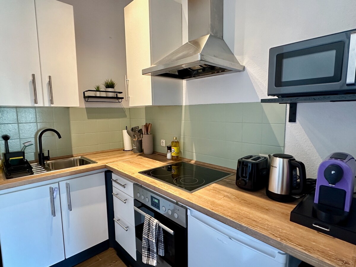 Árasán íoslaigh eisiach nua - athchóirithe le bealach isteach ar leith sa teach ciúin scoite. Cistin nua - aimseartha le beár; feistithe go hiomlán le hob, oigheann, cuisneoir, déantóir caife le caife saor in aisce, citeal, tóstaer agus soláthairtí cócaireachta laethúla. HD Smart - TV (Sat - TV, Netflix, Amazon Video, etc...) und highspeed W - LAN. Leaba mhór mhéid banríona le tocht cúr cuimhne chompord. Seomra folctha ar ardchaighdeán le cithfholcadán siúil isteach, doirteal, leithreas agus triomadóir gruaige.