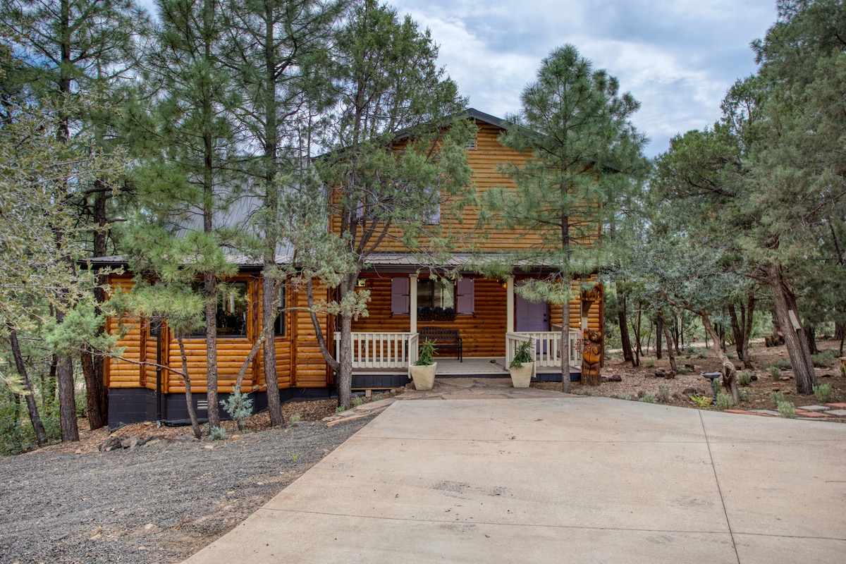 2 stáisiún deisce iontacha - 1 thíos staighre le deasc agus 1 deasc sa lochta , atá feistithe le 22" monatóir, cáblaí HDMI agus neart plocóidí. 1 BR thíos staighre le Leaba Rí teolaí agus rochtain ar fholcadán iomlán, lochta 500 troigh cearnach le 2 leaba bhanríona, leaba lae, pacáiste agus súgradh, 2 theilifís agus 1/2 seomra folctha. Sé Pines Lodge Hexagon Fíor Log Cabin! Fálaithe go hiomlán agus Oiriúnach do pheataí! Níl le déanamh ach do earraí níocháin a thabhairt leat agus bain sult as na Sléibhte Bána áille in Arizona!