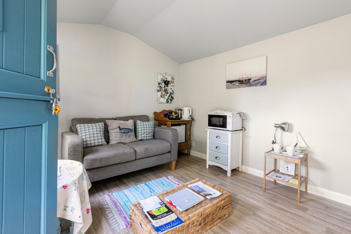 Tá leaba dhúbailte chompordach, teilifís chliste, Vardrús, beár bricfeasta/stáisiún oibre ríomhaire glúine, roinnt pointí USB, micreathonnán, cuisneoir, tóstaer, citeal, doirteal/draenálaí le huisce te & fuar Cuirtear leithreas ceimiceach ar fáil sa chábán le haghaidh úsáid oíche. Tá leithreas príobháideach & cithfholcadán te iontach lasmuigh (de réir na ngrianghraf) d'úsáid an aoi. Tá an veranda decked tosaigh taobh le cistin lasmuigh le hob gáis 2 fháinne agus beárbaiciú tógtha ag breathnú amach ar ghairdín mór a bhfuil radharc álainn uaidh ar an bhfarraige/luí na gréine.