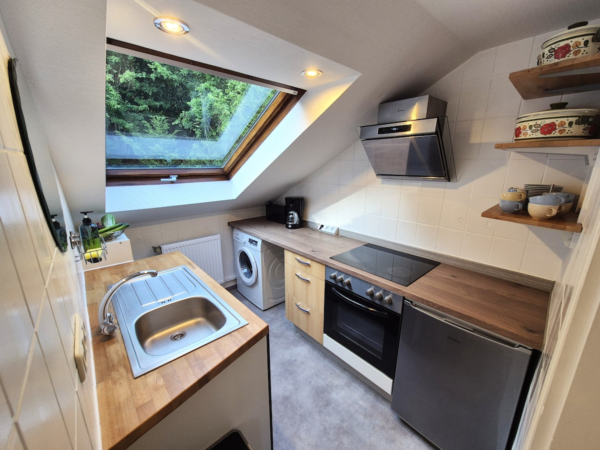 16 méadar cearnach coziness i bungaló cairdiúil faoi throscán do 2 dhuine. Suíomh ciúin timpeallaithe ag duilliúr, in aice le foraois, móinéir agus páirceanna! Cuireann an chistinéad gach rud atá uait ar fáil, chomh maith le doirteal, cuisneoir, cócaireán ionduchtaithe dúbailte, citeal, déantóir caife agus tóstaer. Tá dhá lampa cois leapa agus seilfeanna teolaí cois leapa sa leaba dhúbailte chluthar (160m x 200m). Tá go leor spáis stórála curtha ar fáil ag dhá sheilf, an spás faoin leaba agus go leor crúcaí balla.