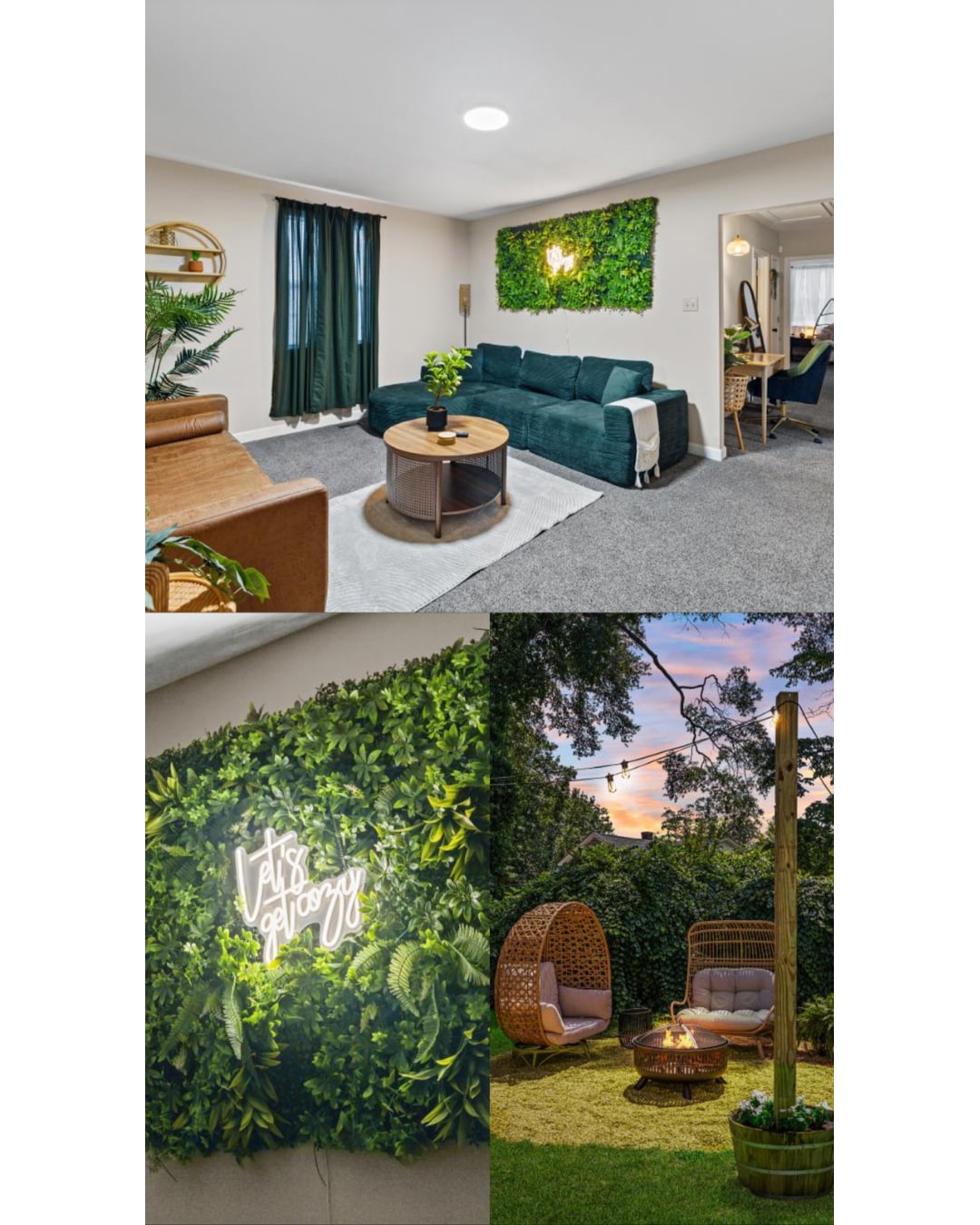 Welcome to the cozy Bo-Haven cottage featuring an outdoor oasis 🪴 Boho swivel chair, Fire pit W/ lights. Comfortable, Stylish, fully stocked and a relaxing space with a dedicated work desk area. Conveniently located to local shopping, restaurants, parks and more. Each bedroom is fully equipped with a queen sized bed and Roku smart tv’s with Netflix included. Kitchen includes a full coffee bar with a Keurig machine. Coffee, Hot chocolate & tea available! Convenient location!