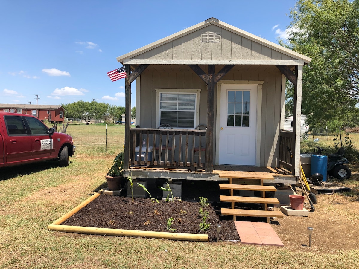 Tá ár gCábán Cábáin Calma Oasis suite díreach taobh amuigh de theorainneacha cathrach San Antonio. Táimid 20 nóiméad ó lár San Antonio, siúlóid na habhann, Alamo, agus Túr Mheiriceá. Tá leaba chompordach le codladh sa chábán, tolg a dhéanann leaba chun do scíth a ligean air, agus bord le hithe nó le hoibriú ann. Ar bhord eile gheobhaidh tú cuisneoir/reoiteoir meánmhéide, micreathonnán, Keurig, earraí páipéir, caife, agus bosca lán sneaiceanna. Tá seomra folctha en - suite sa chábán freisin.