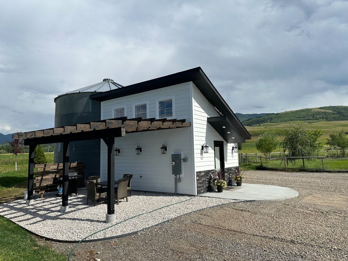 Bain sult as áilleacht agus scíth a ligean ar acra talún agus féaraigh capall agus tú nóiméid ó Hyalite Canyon & Reservoir (cuid de na fánaíochta is fearr, iascaireacht, snámh, bádóireacht, dreapadóireacht oighir, srl.) agus 10 nóiméad ón mbaile. Tá an teach aíochta (an 2ú hurlár d'fhoirgneamh scoite ar ár réadmhaoin) os cionn 1,000 troigh chearnach agus is áit fhoirfe é le húsáid mar bhunchamp agus tú ag iniúchadh Bozeman agus na ceantair máguaird. Is bealach foirfe é an tobán te ar a bhfuil radhairc shléibhe chun do scíth a ligean ó do lá.