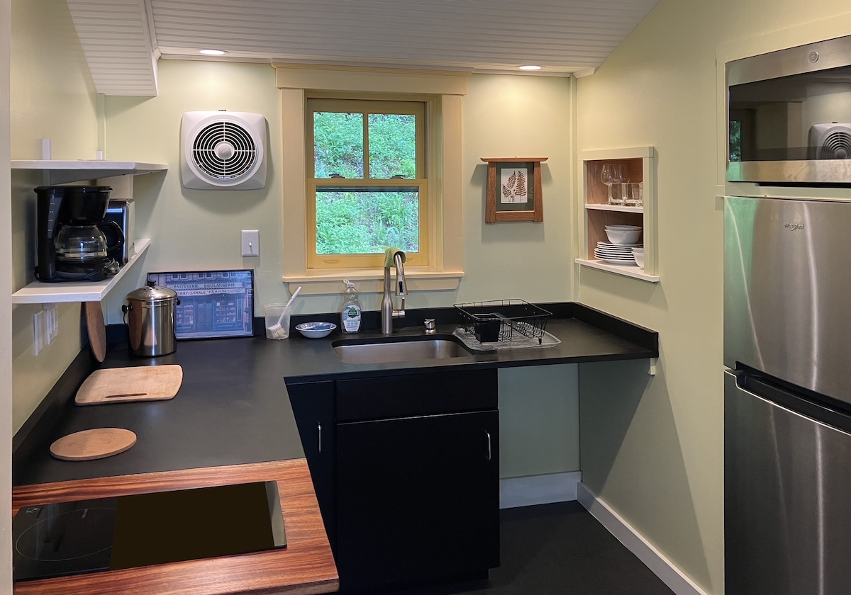 Tá an seomra seo leath d’urlár inár bhfoirgneamh stiúideo (35 méadar cearnach).Is é an t-aon spás áitithe san fhoirgneamh, atá scartha ón bpríomhtheach ag clós.Tá leaba ar mhéid banríona, folcadán iomlán (cithfholcadán gan chur isteach), agus cithfholcadán lasmuigh (nach bhfuil ar fáil sa gheimhreadh) Cistin bheag ina bhfuil doirteal, cuisneoir, iarta ionduchtaithe 2 dhóire, oigheann micreathonnach/comhiompair, tóstaer, pota caife, agus gréithe cócaireachta. Uasteorainn suite, le gaothrán síleála, fuinneoga móra, deic, agus ealaín luibheolaíoch Maggie ag líneáil na mballaí.