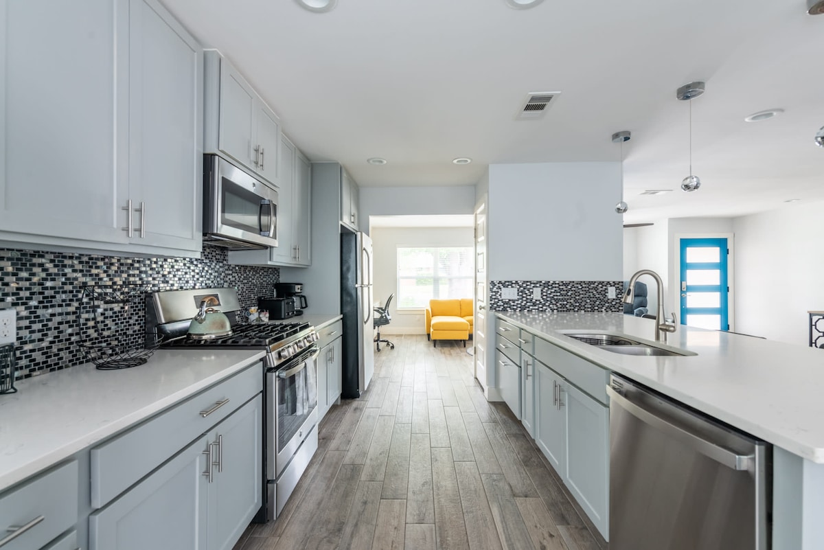 Fáilte! Tá an teach nuathógtha seo i lár Austin le rochtain éasca ar Downtown, Moody Center, UT, Asian Town, agus an Fearann. Tá tú níos lú ná 10 nóiméad ó na háiteanna seo go léir agus 30 nóiméad ar iompar poiblí. Bain sult as eispéireas áitiúil in Austin trí rochtain a fháil ar na bialanna, na beáir agus na siopaí is fearr le muintir na háite in aice láimhe. Tá teilifíseán 70 orlach 4K, luchtaire EV, meaisín caife, deasc oifige, tolg leathair sa teach dhá leibhéal chun go mbeidh eispéireas galánta agat ag an áit seo atá suite go lárnach in Austin.