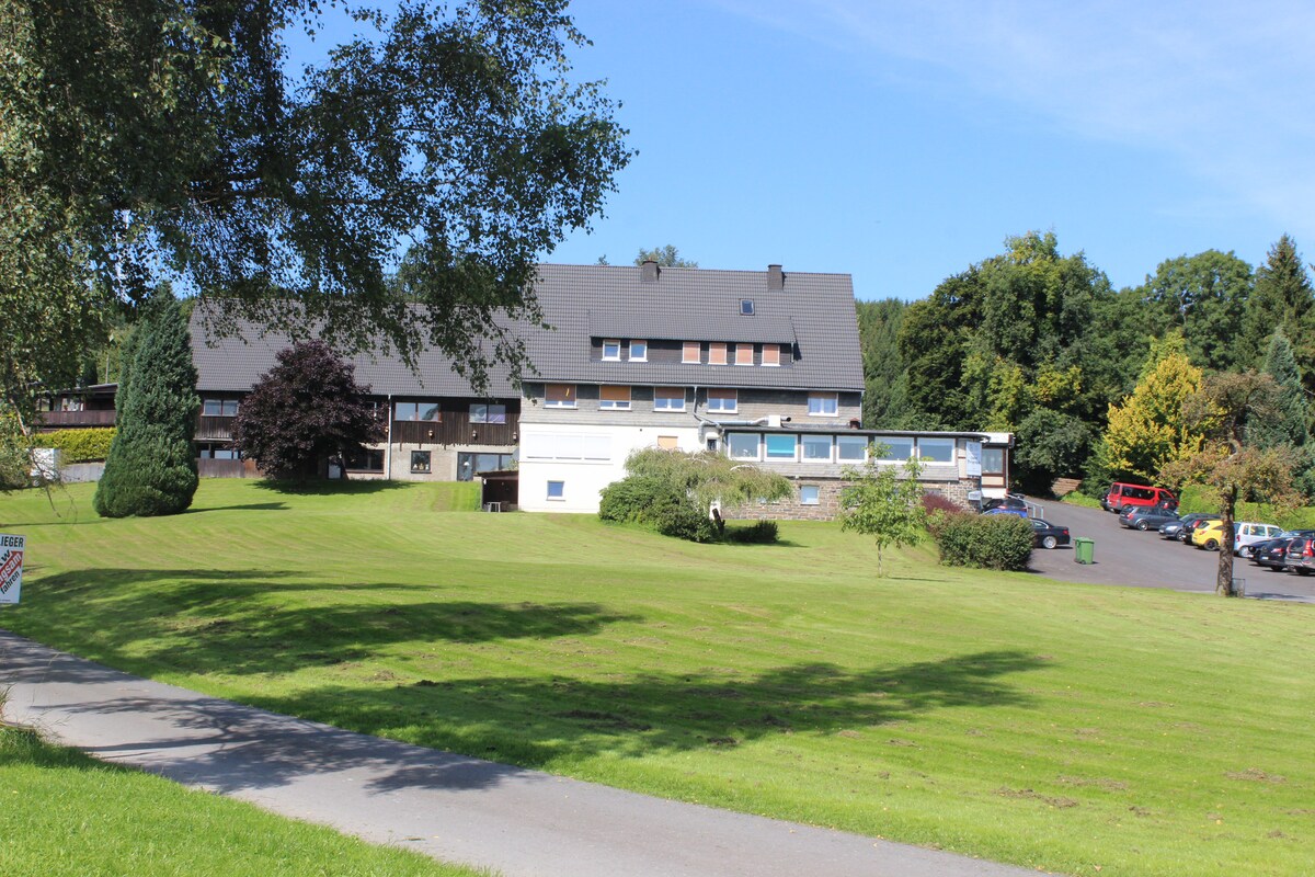 Dia dhuit Tá an FEWO 65m² i méid le 2 sheomra leapa Seomra suí le radhairc iontacha ón mbalcóin. Táimid suite ar ard - ard le radharc thar a bheith álainn. 555 müNN I leithlisiú iomlán gan aon bhóthar idirthurais. Anseo, mar a déarfá, críochnaíonn an bóthar. Go leor cosáin fánaíochta go díreach ag an teach . Ina theannta sin, tá go leor cinn scríbe turais in aice láimhe . Ina measc seo tá Fort Fun , Panoramapark, Hennesee 10min, Möhnesee ca 45min, ca 30min,paraglider agus crochta beagnach ag an teach. Spóirt airfield Schüren 3km Linn snámha 7km