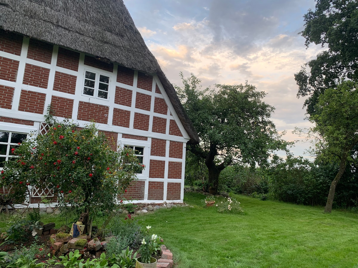 Teach stairiúil faoi dhíon tuí ar dhíog an tSeanchno Teachín clúmhach cláraithe ón 18ú haois le díon tuí i gceantar ciúin gan aon bhealach amach díreach ar dhíog na hEilbe – foirfe chun do scíth a ligean. Níl trá ghainimh Krautsand ach thart ar 4 km ar shiúl. Téann Conair Rothaíochta na hEilbe díreach taobh amuigh den doras agus tá bealaí áille rothaíochta agus fánaíochta inti. Foirfe dóibh siúd atá ag lorg suaimhnis, dúlra agus scíthe.