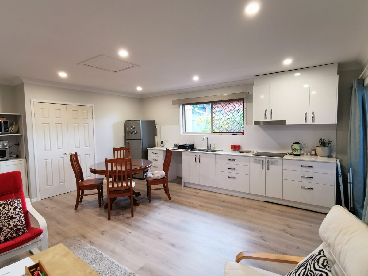Tá áit shuaimhneach chiúin le fanacht sa teachín seo agus radharc ar tor na hAstráile. Cibé an bhfuil tú ag saoire, ag athlonnú go Brisbane, ag fanacht le do theach go deo a thógáil, is é seo an áit iontach do theaghlaigh. Táimid suite 30 nóiméad ó Brisbane, 20 nóiméad ón aerfort, 20 nóiméad go Cleveland agus 10 nóiméad go Sirromet Winery. Beidh paitió príobháideach agat ina bhfeicfidh tú ballaí, koalas agus go leor beatha éan, spá folctha lasmuigh, poll dóiteáin mór agus glasra méith chun go mbainfidh tú taitneamh as.