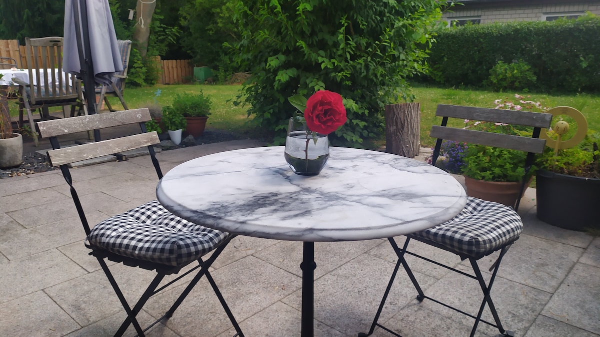 Árasán íoslaigh eisiach nua - athchóirithe le bealach isteach ar leith sa teach ciúin scoite. Cistin nua - aimseartha le beár; feistithe go hiomlán le hob, oigheann, cuisneoir, déantóir caife le caife saor in aisce, citeal, tóstaer agus soláthairtí cócaireachta laethúla. HD Smart - TV (Sat - TV, Netflix, Amazon Video, etc...) und highspeed W - LAN. Leaba mhór mhéid banríona le tocht cúr cuimhne chompord. Seomra folctha ar ardchaighdeán le cithfholcadán siúil isteach, doirteal, leithreas agus triomadóir gruaige.