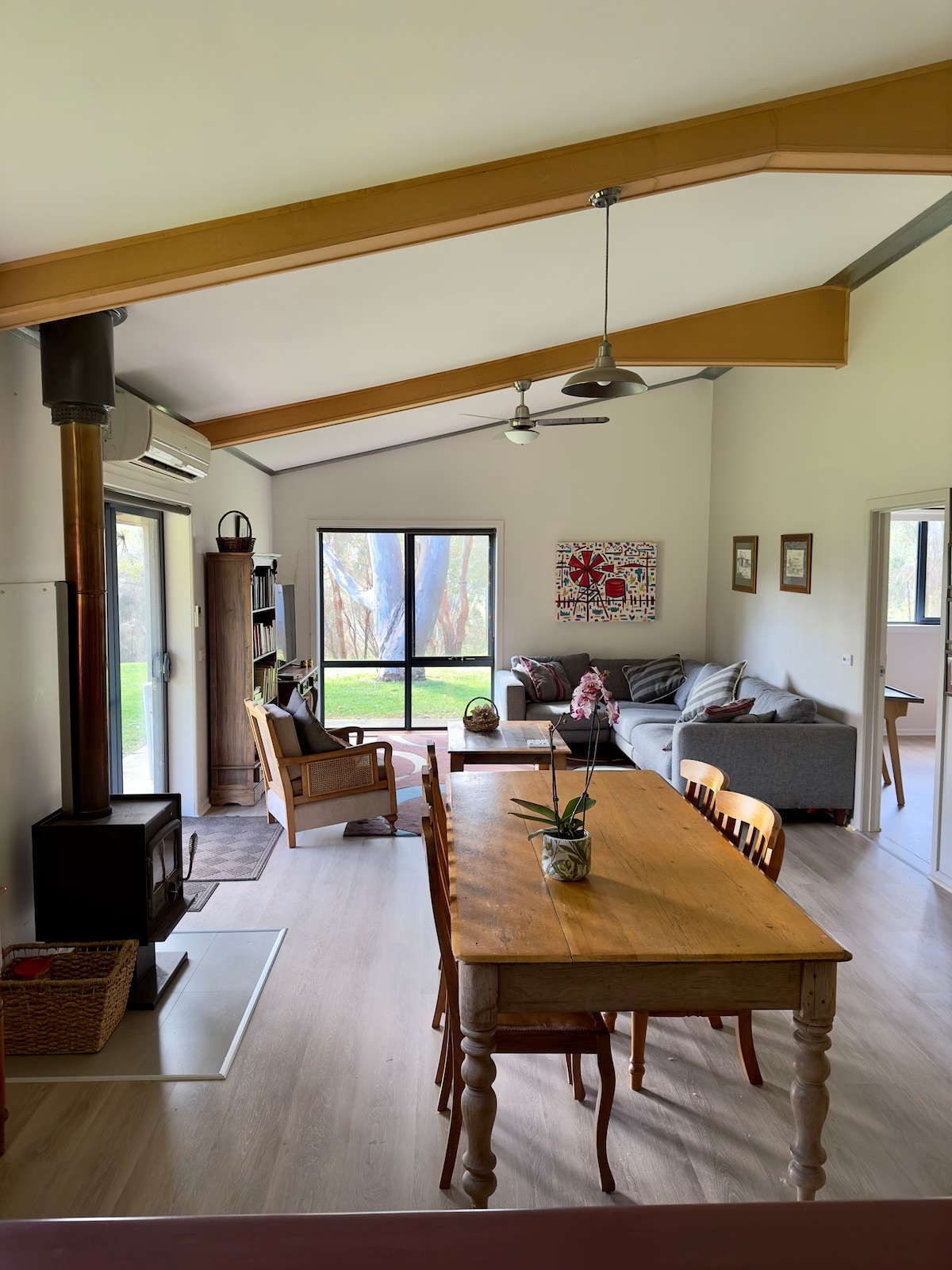 A private bush retreat near Beechworth — designed to slow down and switch off. Fully equipped with reliable power and hot showers, with a fireplace for warmth — all the comfort of home, without the crowds. Unwind by the fire, soak in the outdoor bath and step out under the stars. Venture out to wineries and local history if you wish, then return to your own secluded escape. Sleeps up to 6, however best suited to couples or small groups seeking space, privacy and time to enjoy it.