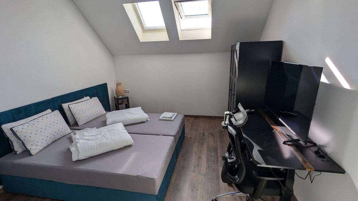 Fanfaidh tú i lár na cathrach inár n - árasán déphléacsach atá feistithe go grámhar. Tá siopaí laistigh d'achar siúil (Rewe 2 nóiméad, Rossmann 2 nóiméad, bialanna timpeall an chúinne) Tá fáilte roimh pháistí! Tá Balcóin ar fáil (féach na pictiúir)
