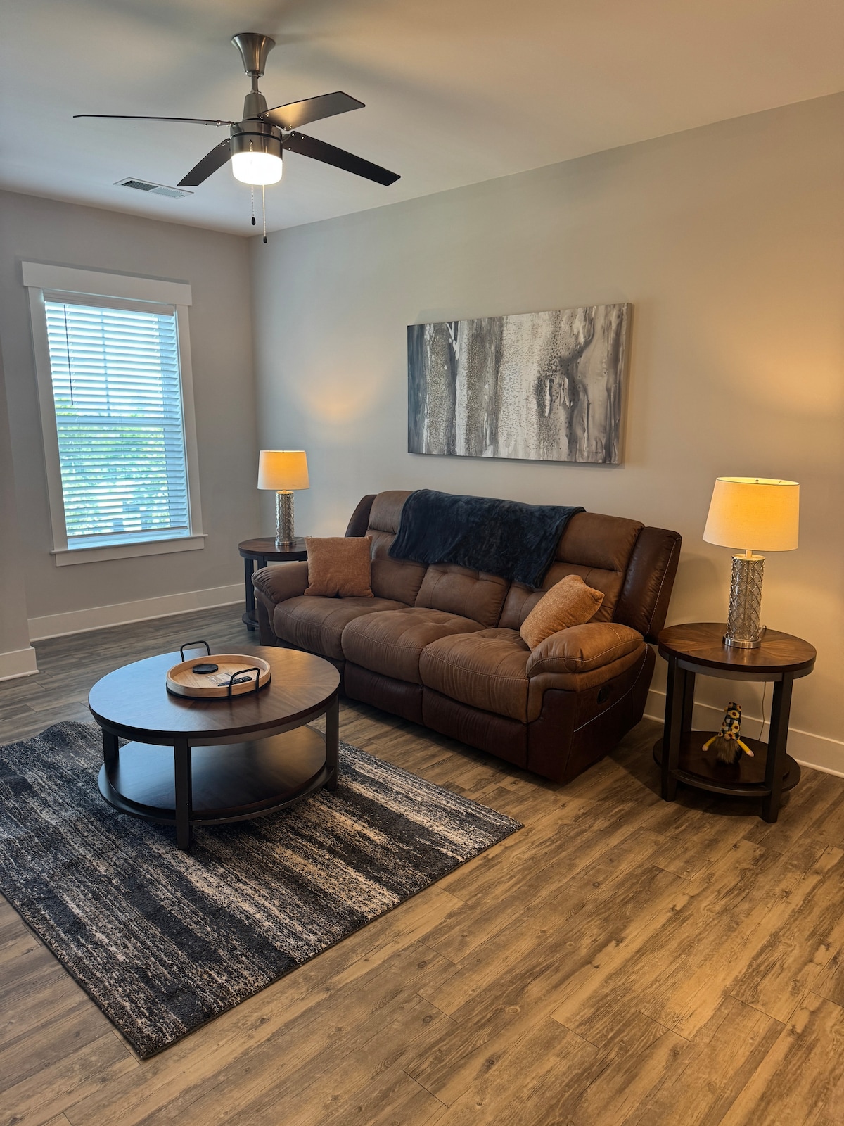 Suite sé mhíle ó Pháircbhealach álainn Blue Ridge. Níl ach 15 nóiméad ó Eastát stairiúil an Bhinn Mhóir. Tá tiomáint 15 nóiméad chuig Downtown Asheville agus Chimney Rock 15 míle. Go leor bialanna iontacha in aice láimhe. Tá cistin ar mhéid an teaghlaigh againn más mian leat cócaireacht a dhéanamh anseo. Siopa grósaera 1/2 míle ar shiúl. Téigh ag siúl, ag marcaíocht ar rothar, nó téigh ar ais agus bain sult as an tráthnóna ar an bpóirse cúil le casóg lasmuigh. Tá spás dóiteáin againn freisin le cathaoireacha chun taitneamh a bhaint as an taobh amuigh. Tar linn agus bí ar do shuaimhneas.