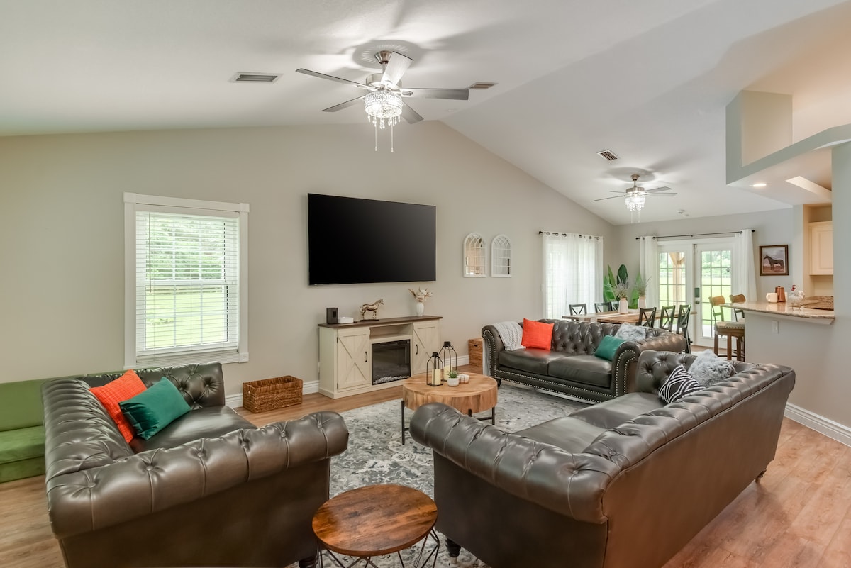 Bíodh Ocala ar do sháimhín só ag an teach ranch sómasach seo, atá suite 5 nóiméad ón Ionad Eachaíochta Domhanda. Suite laistigh de réadmhaoin eachaíocht iontach díreach in aice le Mórbhealach 40, meascann an áit chónaithe fhairsing seo compord nua-aimseartha le galántacht chlasaiceach, rud a fhágann go bhfuil sé ina thearmann foirfe do theaghlaigh, do ghrúpaí, nó do dhíograiseoirí eachaíochta. Foirfe d'iomaitheoirí eachaíochta, do chuairteoirí séasúracha, nó d'aon duine atá ag iarraidh scíth a ligean go compordach agus go galánta i bPríomhchathair Eachaíochta an Domhain!