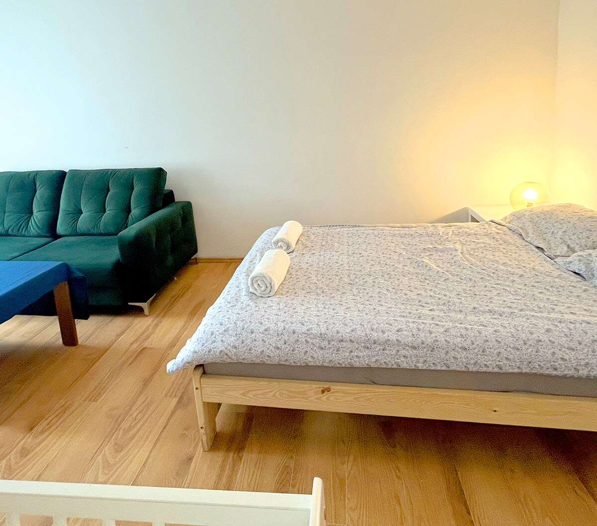 Apartament do wynajęcia dla 3 osób z aneksem kuchennym oraz łazienką z prysznicem. Znajdują się tam 2 łóżka, rozkładana dwuosobowa sofa, stół i szafa. W ramach wynajęcia apartamentu, można korzystać z pola do minigolfa oraz grilla lub ogniska.
