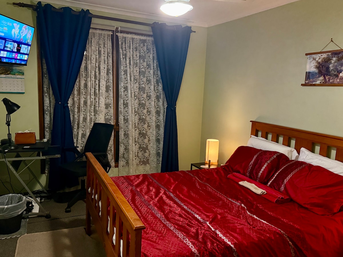 Áit go leor, gar d'Ionad Siopadóireachta Pacific Werribee, thart ar 5 nóiméad sa charr. 3 stad bus in aice láimhe, agus 3 stáisiún traenach (Hoppers Crossing, Werribee, Tarneit), atá suite 7 nóiméad ag tiomáint ón áit seo. Melbourne CBD thart ar 40 nóiméad sa charr. Is féidir le seomra príobháideach ina bhfuil seomra folctha príobháideach ina bhfuil cithfholcadán agus leithreas, ní ensuite ach in aice leis an seomra leapa, leaba mhéid na banríona, tocht aonair a chur leis ar tháille bhreise más gá. Tá cead ag aíonna an chistin agus gach fearas, meaisín níocháin agus carrchlós mór lasmuigh a úsáid.