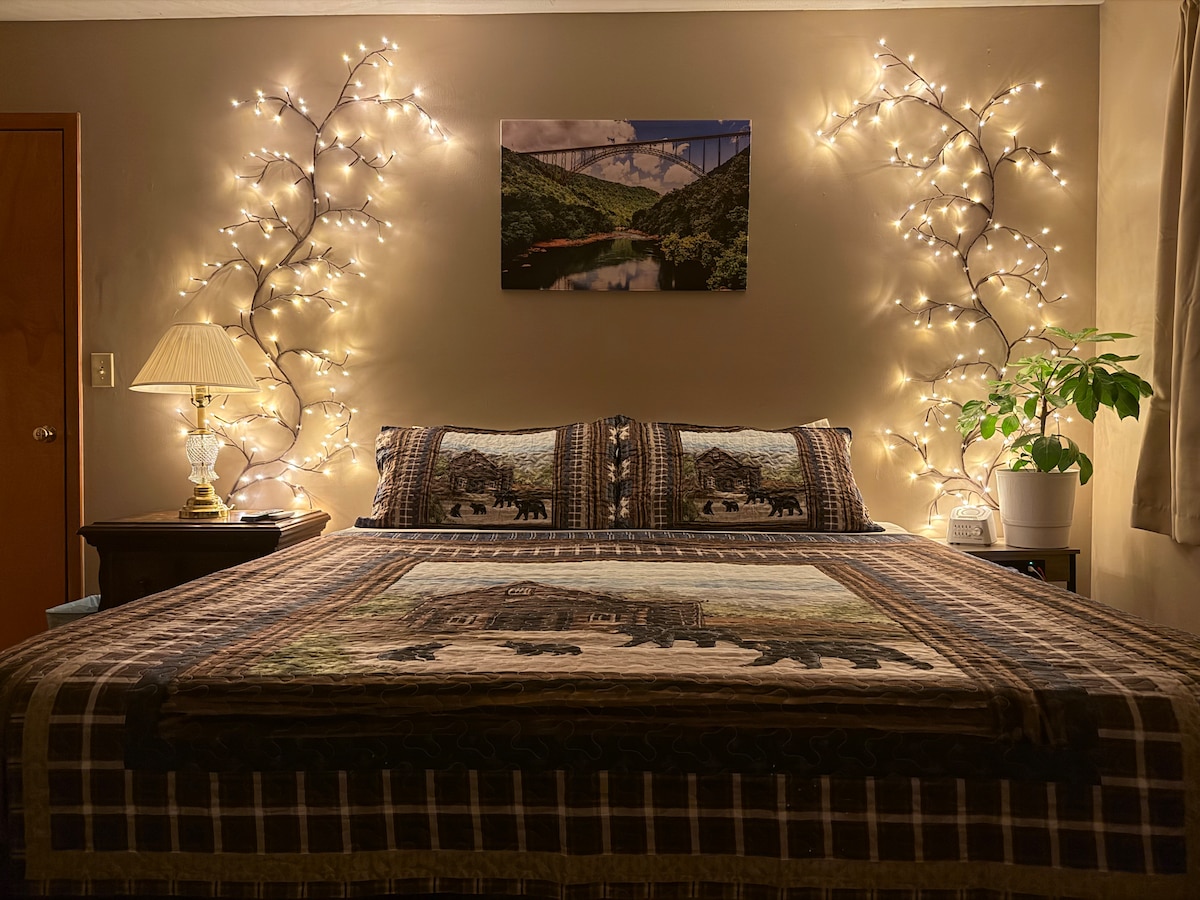 Le dhá leaba bhanríona agus dhá sheomra folctha phríobháideacha, is féidir leat a fháil go léir an t - am ciúin a bhfuil na cnoic WV a thairiscint. Níl sé ach 1 mhíle ón Nascóir Córas Pinnacle Creek le Conairí Hatfield McCoy, is ceann scríbe iontach é ár gcábán do gach marcaigh i mbaile cairdiúil ATV Mullens. Tá Pinnacle Creek ar cheann de na háiteanna is áille atá ag HMT, ag nascadh le Indian Ridge, Pocahontas, & Warrior. Nach bhfuil go leor fós? Tá na seachfhodhlíthe níos lú ná 5 mhíle ónár gcábán. Bí caillte. Aimsigh tú féin in Wild agus Wonderful WV.
