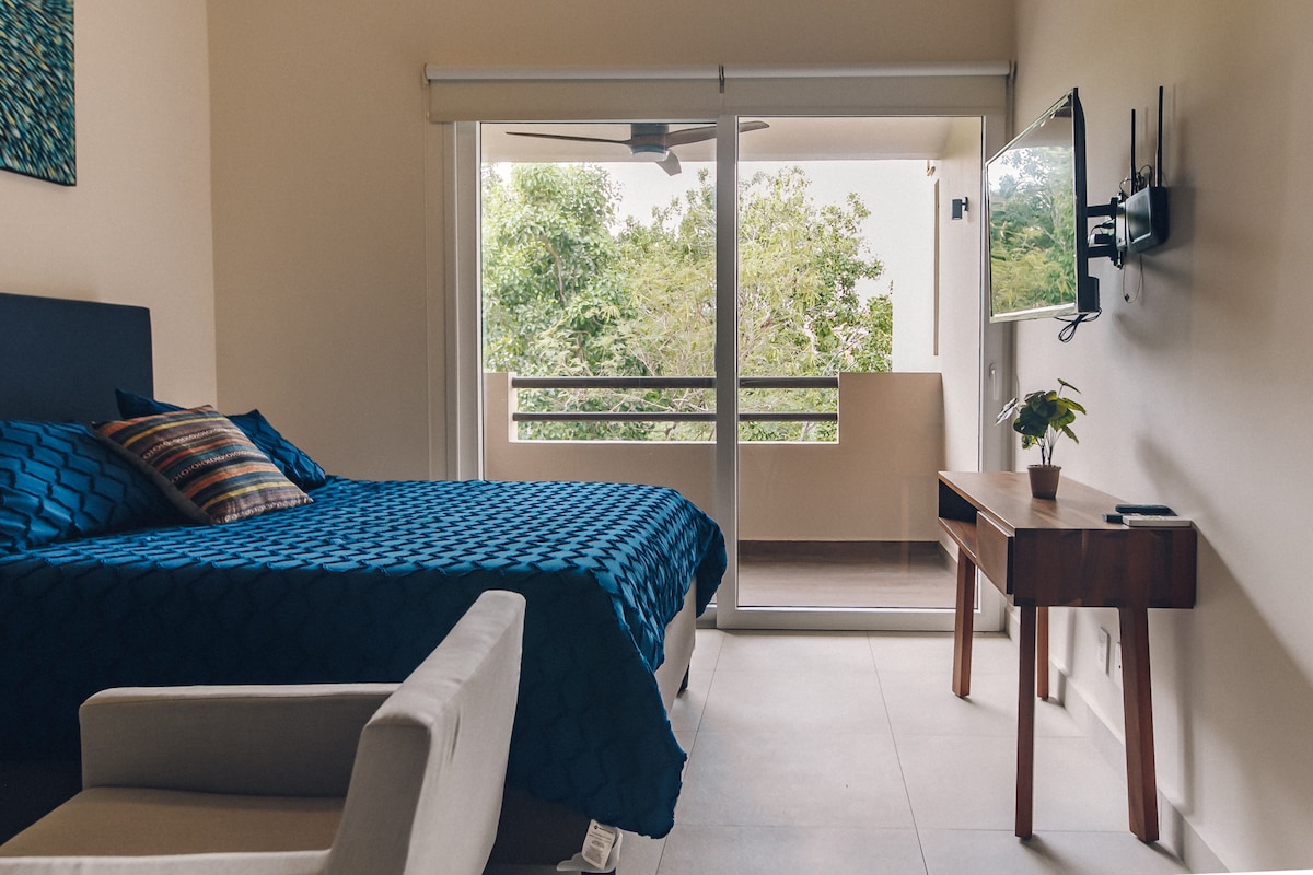 Lóistín den scoth. Suite i mbaile Puerto Maya (ní muiríne). Maisithe le blas scagtha. Mothóidh tú go bhfuil tú sa bhaile. Comharsanacht chiúin ina bhféadfá idirghníomhú leis an daonra áitiúil. Laistigh d'achar siúil, gheobhaidh tú iompar inrochtana chuig an Riviera Maya ar fad, Trá, Cenotes, Páirceanna, Ruins, Mealanna Siopadóireachta, Bialanna agus go leor eile.